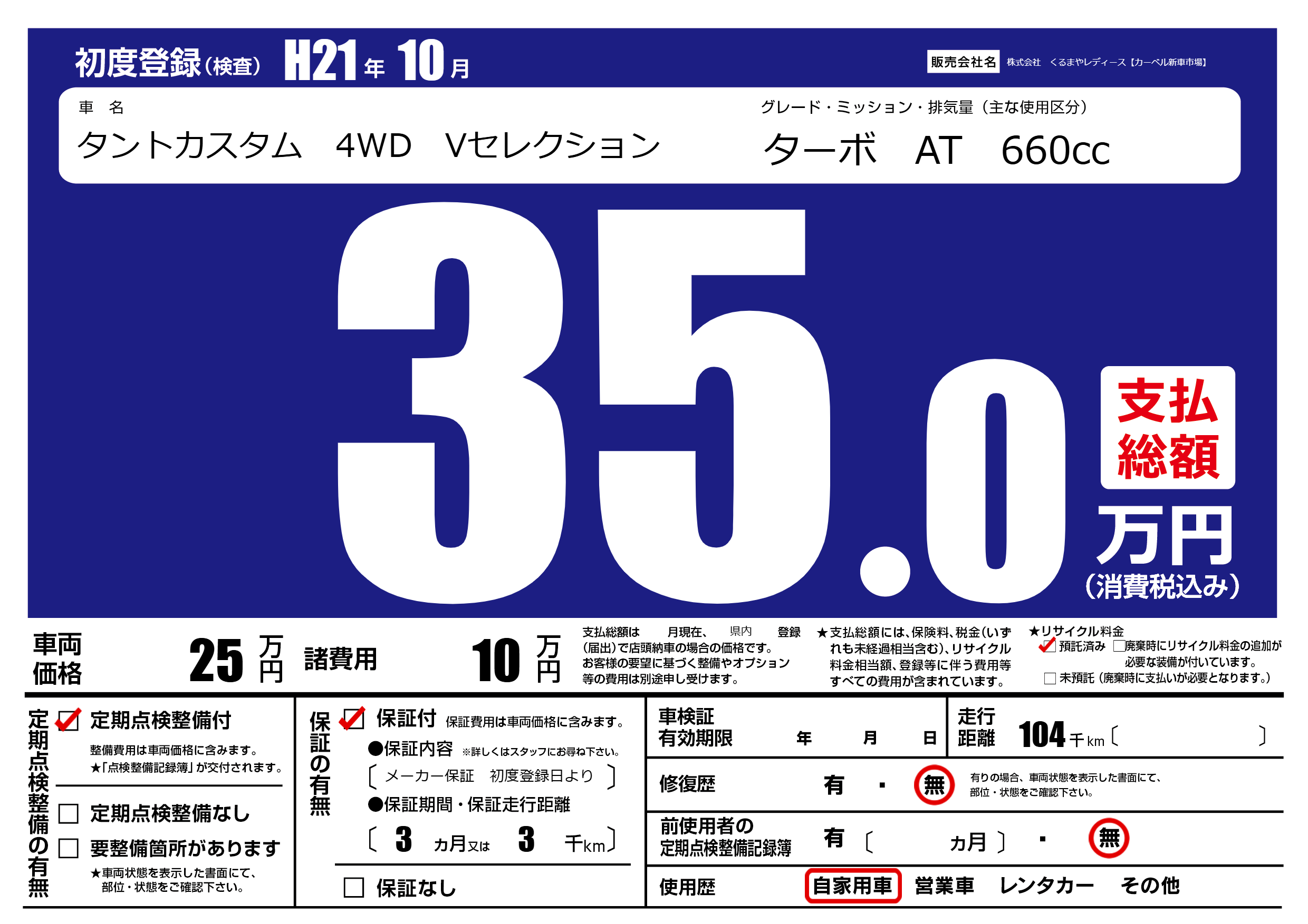| 車名 | タントカスタム 4WD Vセレクション | グレード ミッション 排気量 |