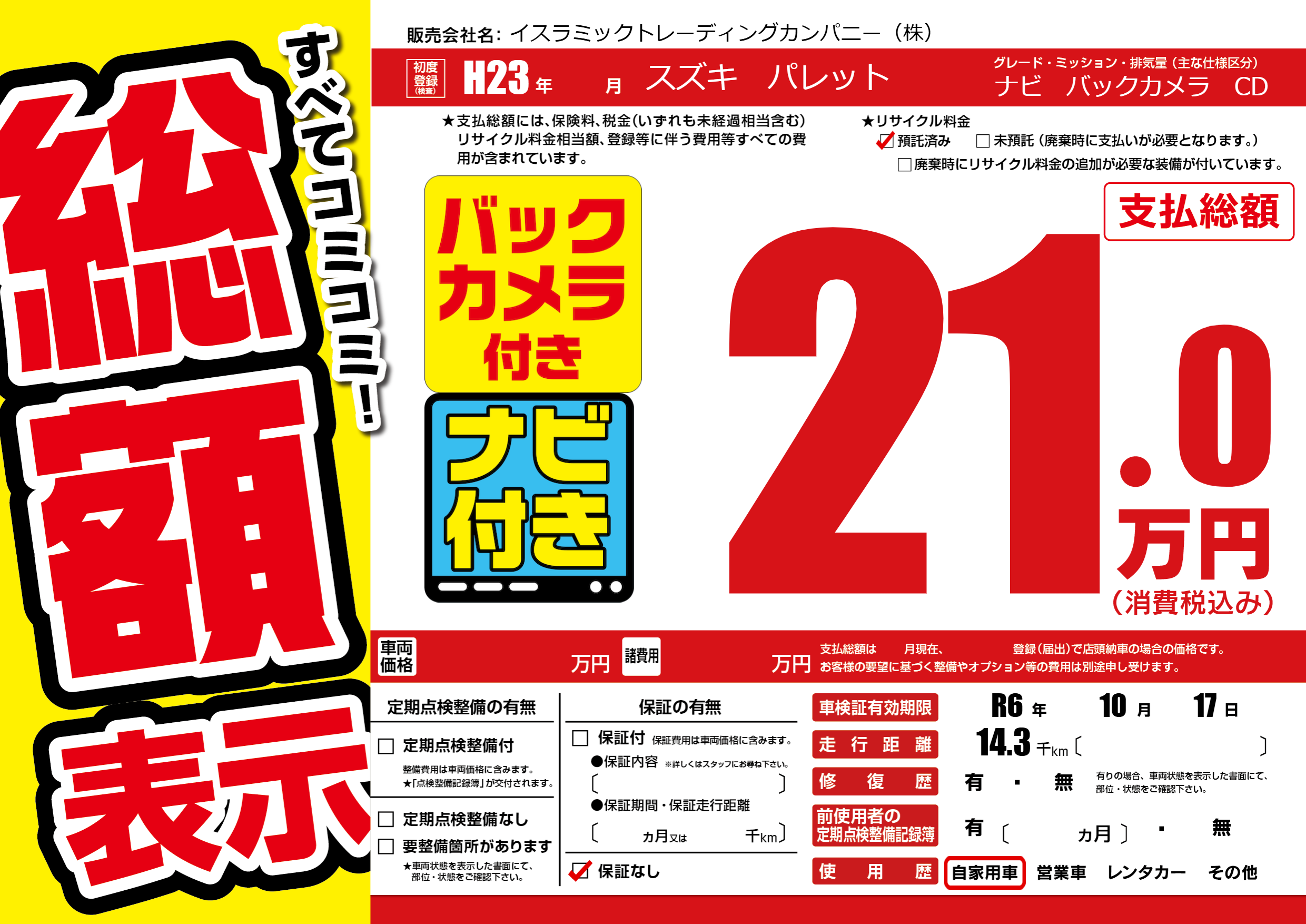 | 車名 | スズキ パレット | グレード ミッション 排気量 |
