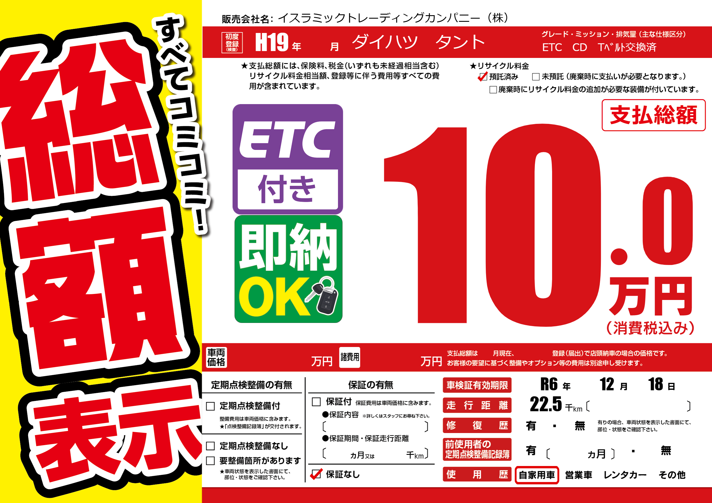 | 車名 | ダイハツ タント | グレード ミッション 排気量 |