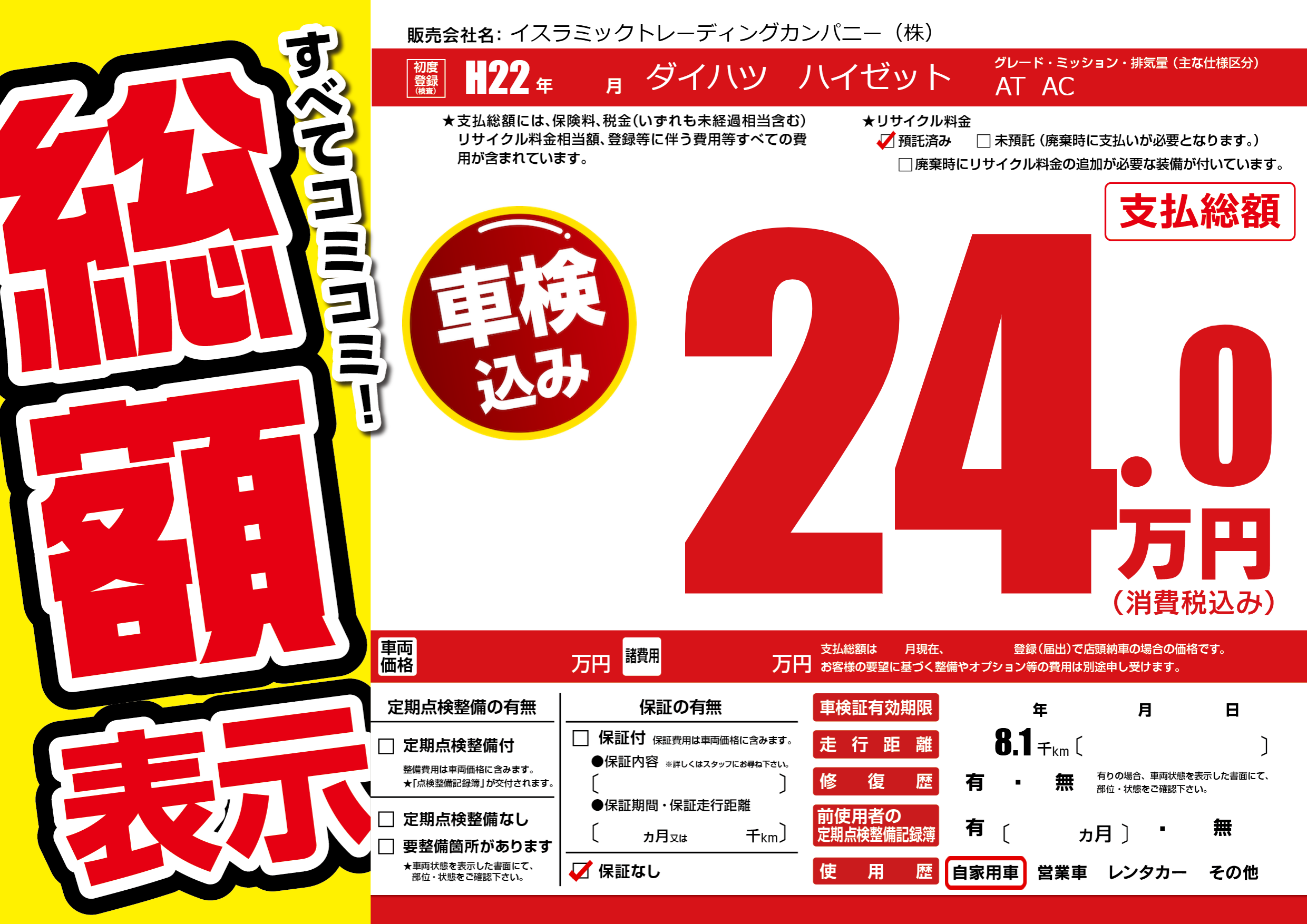 あり | リサイクル預託金相当額 | ( 0円)が別途必要 |