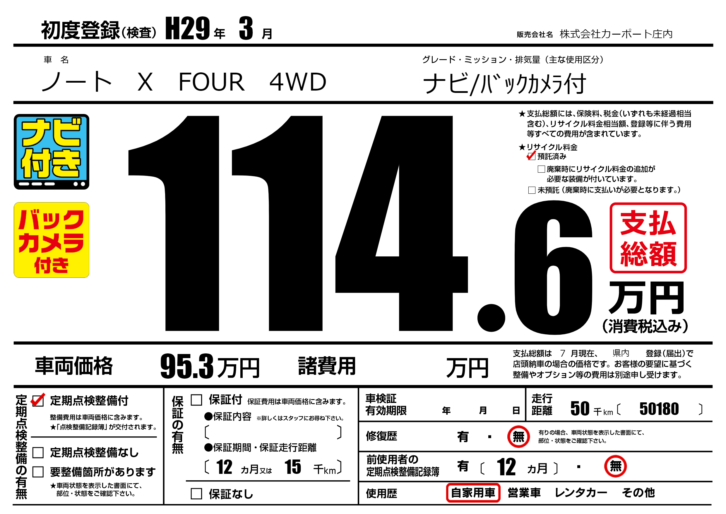| 車名 | ノート X FOUR 4WD | グレード ミッション 排気量 |