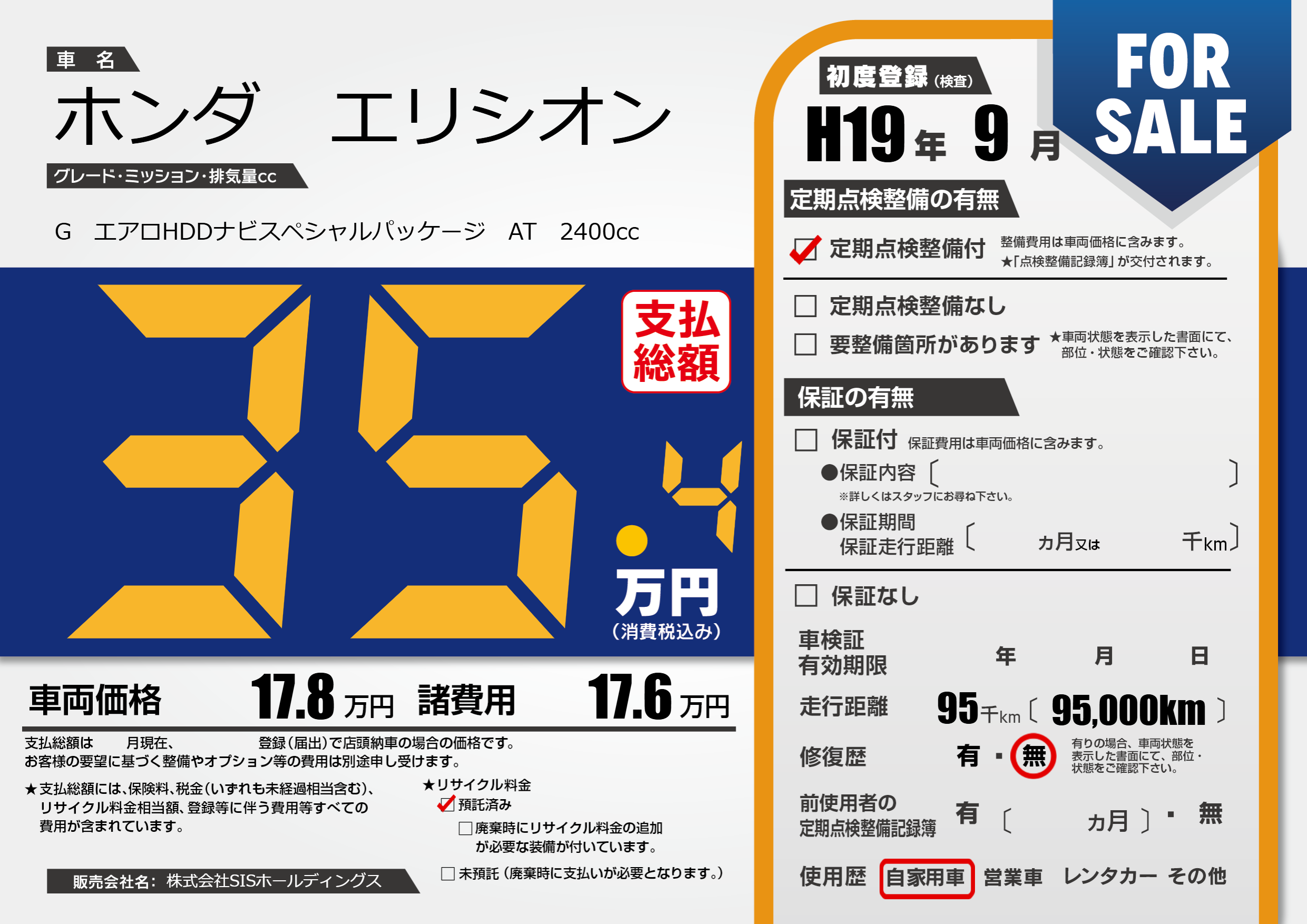 | 走行キロ | 9.5万km | 初年度登録 | H19年9月 |