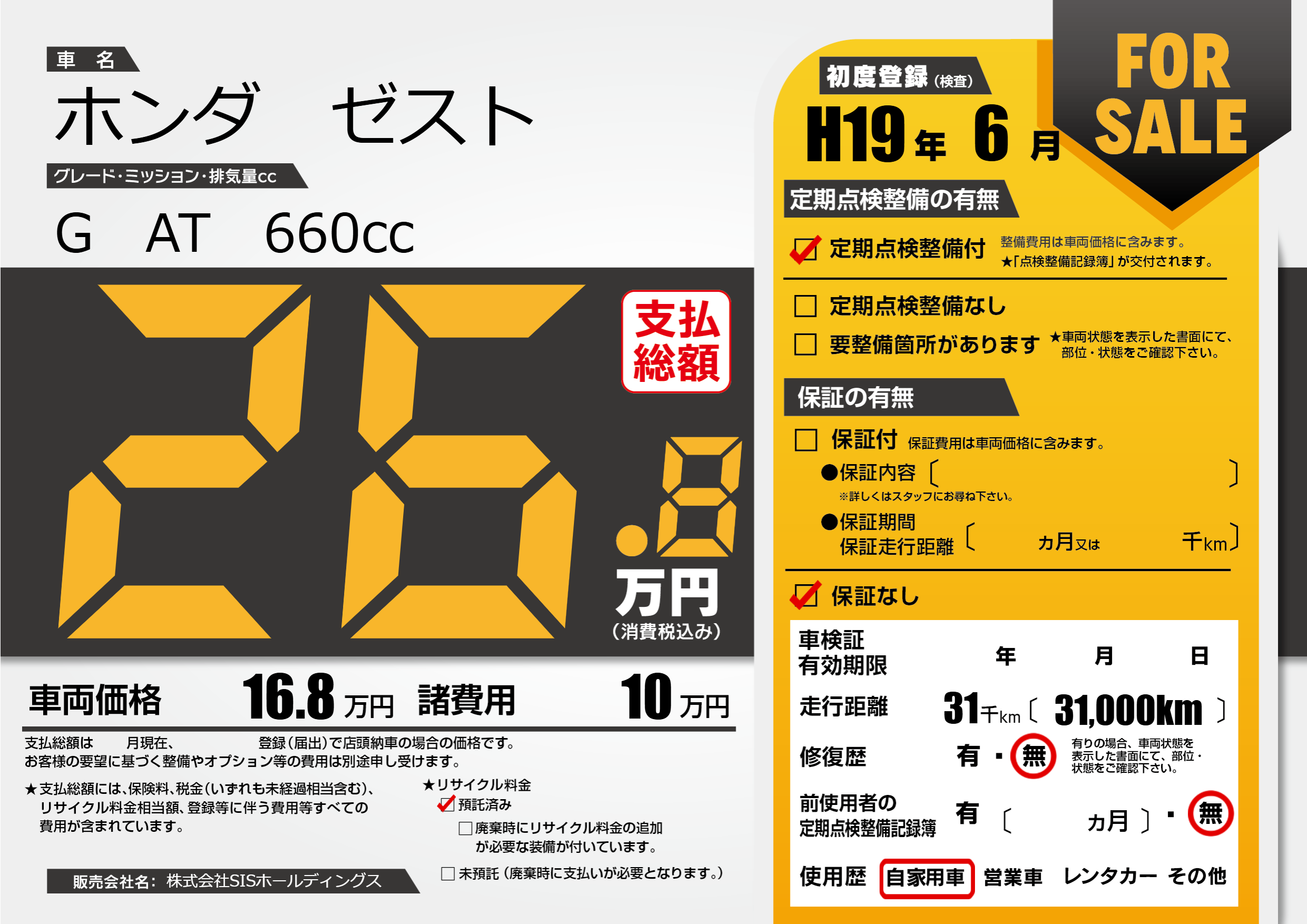 | 車名 | ホンダ ゼスト | グレード ミッション 排気量 |