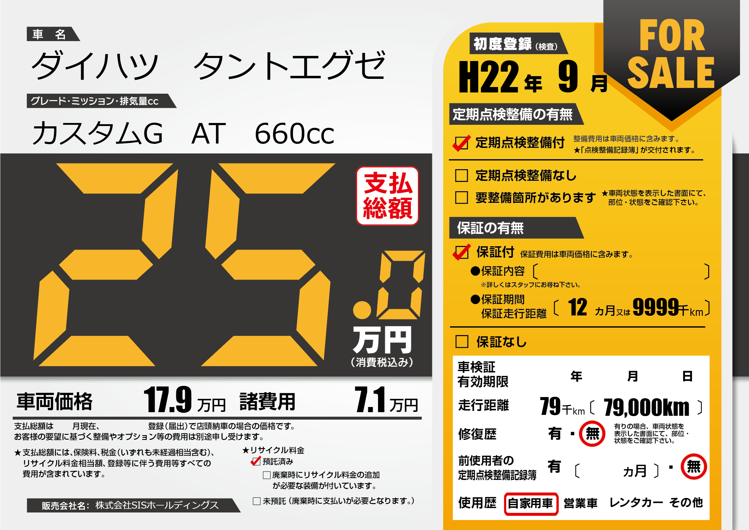 | 走行キロ | 7.9万km | 初年度登録 | H22年9月 |