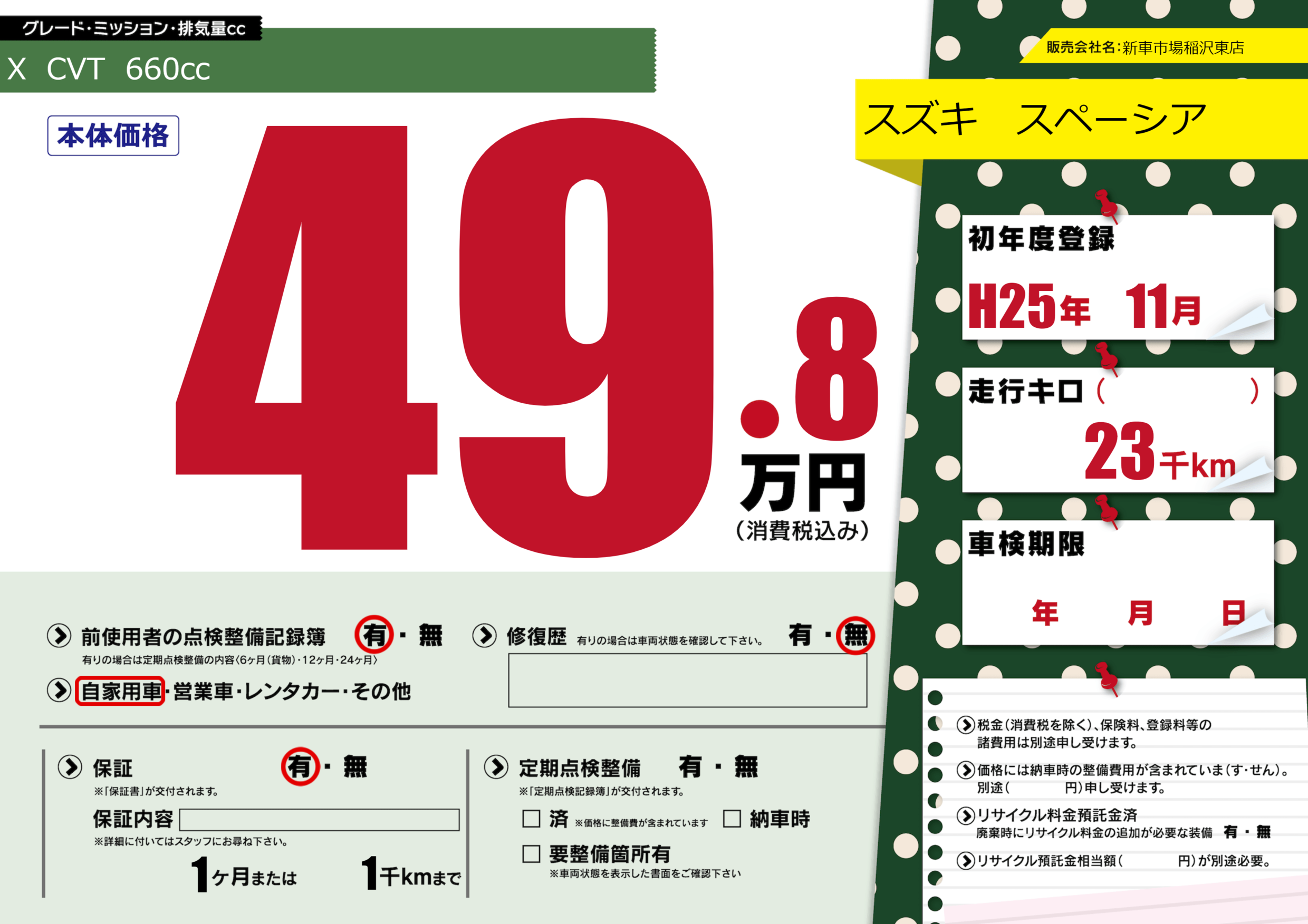 | 車名 | スズキ スペーシア | グレード ミッション 排気量 |