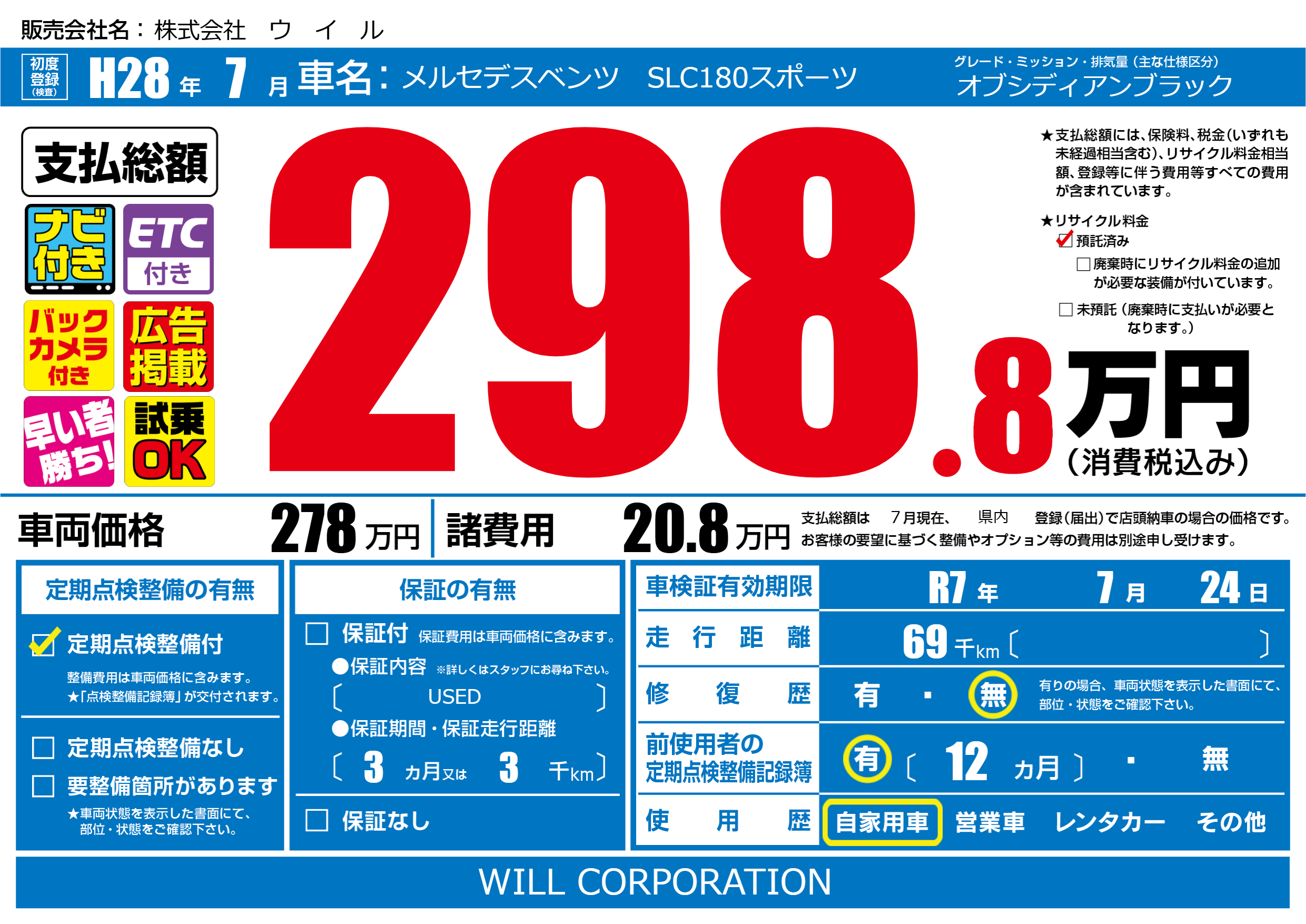 | 車名 | メルセデスベンツ SLC180スポーツ | グレード ミッション 排気量 |