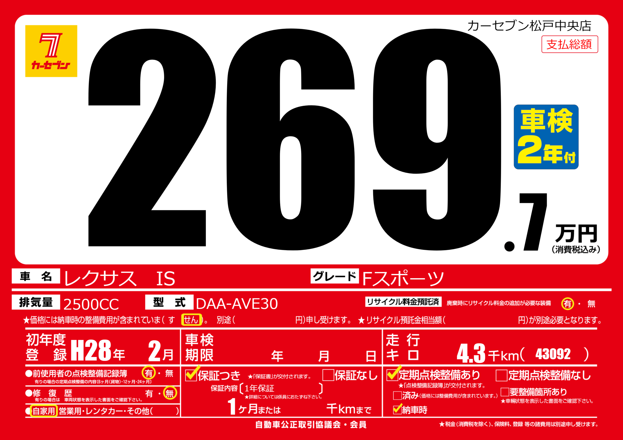 | 車名 | レクサス IS | グレード ミッション 排気量 |