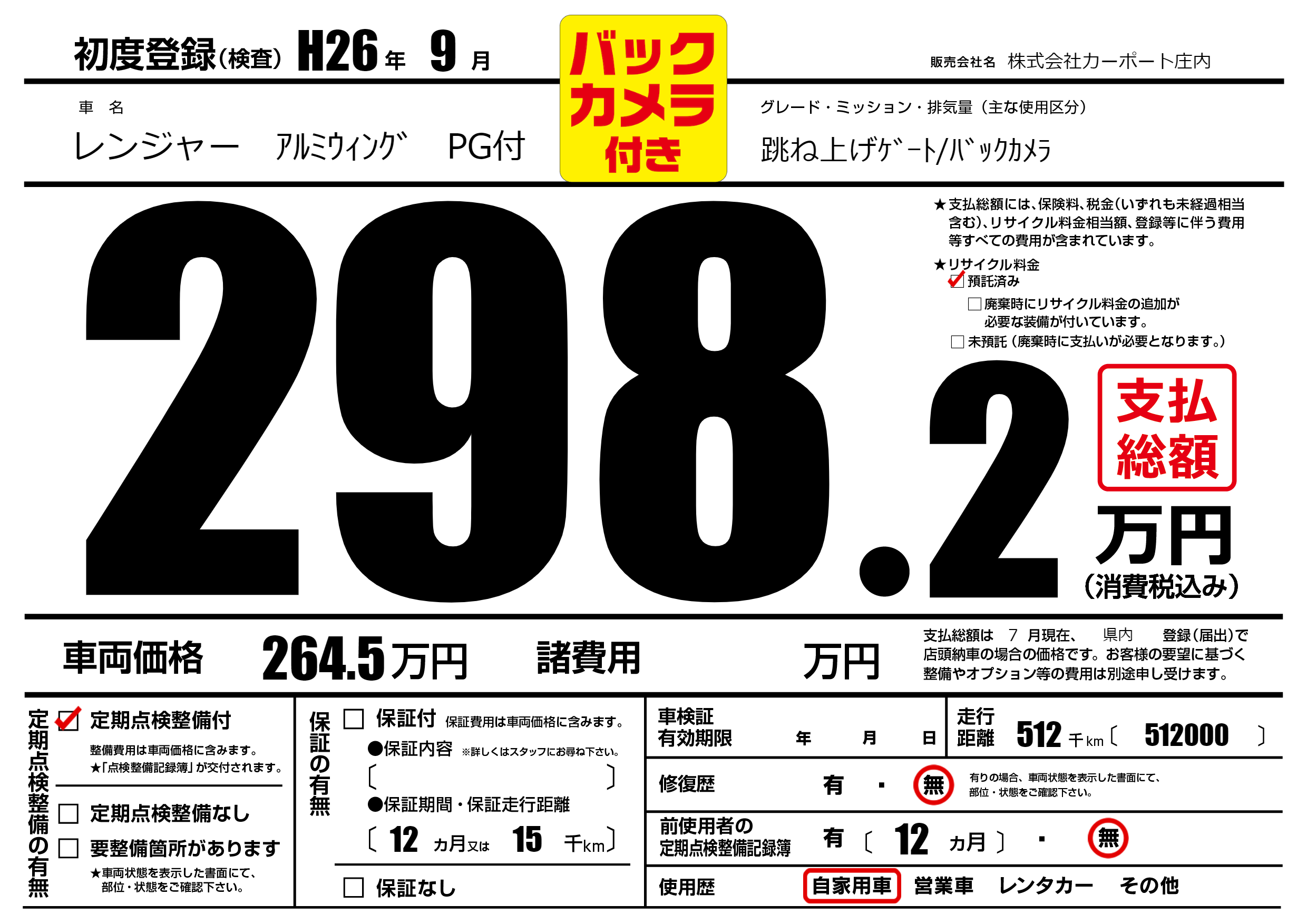 | 走行キロ | 51.2万km | 初年度登録 | H26年9月 |