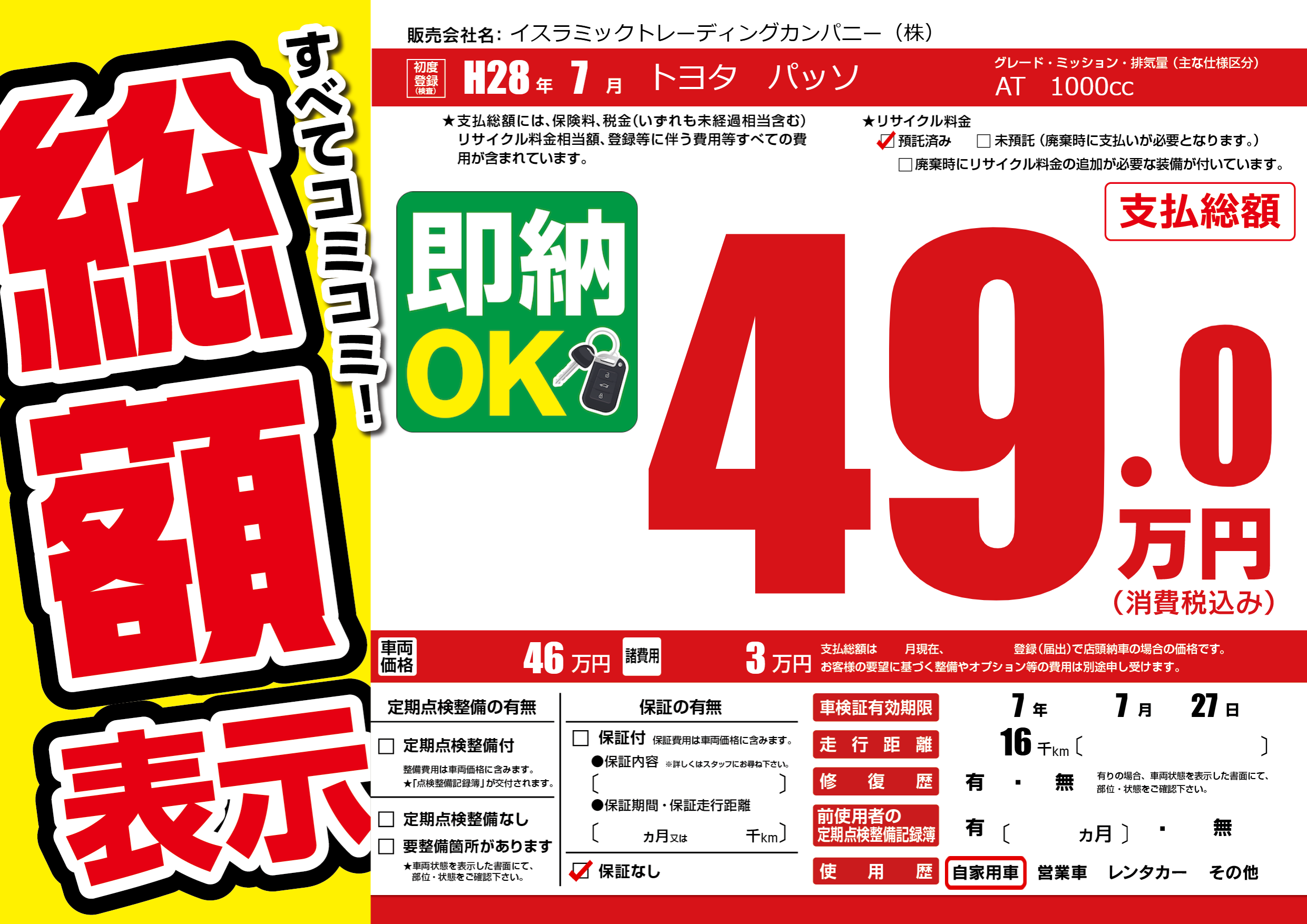 | 車名 | トヨタ パッソ | グレード ミッション 排気量 |