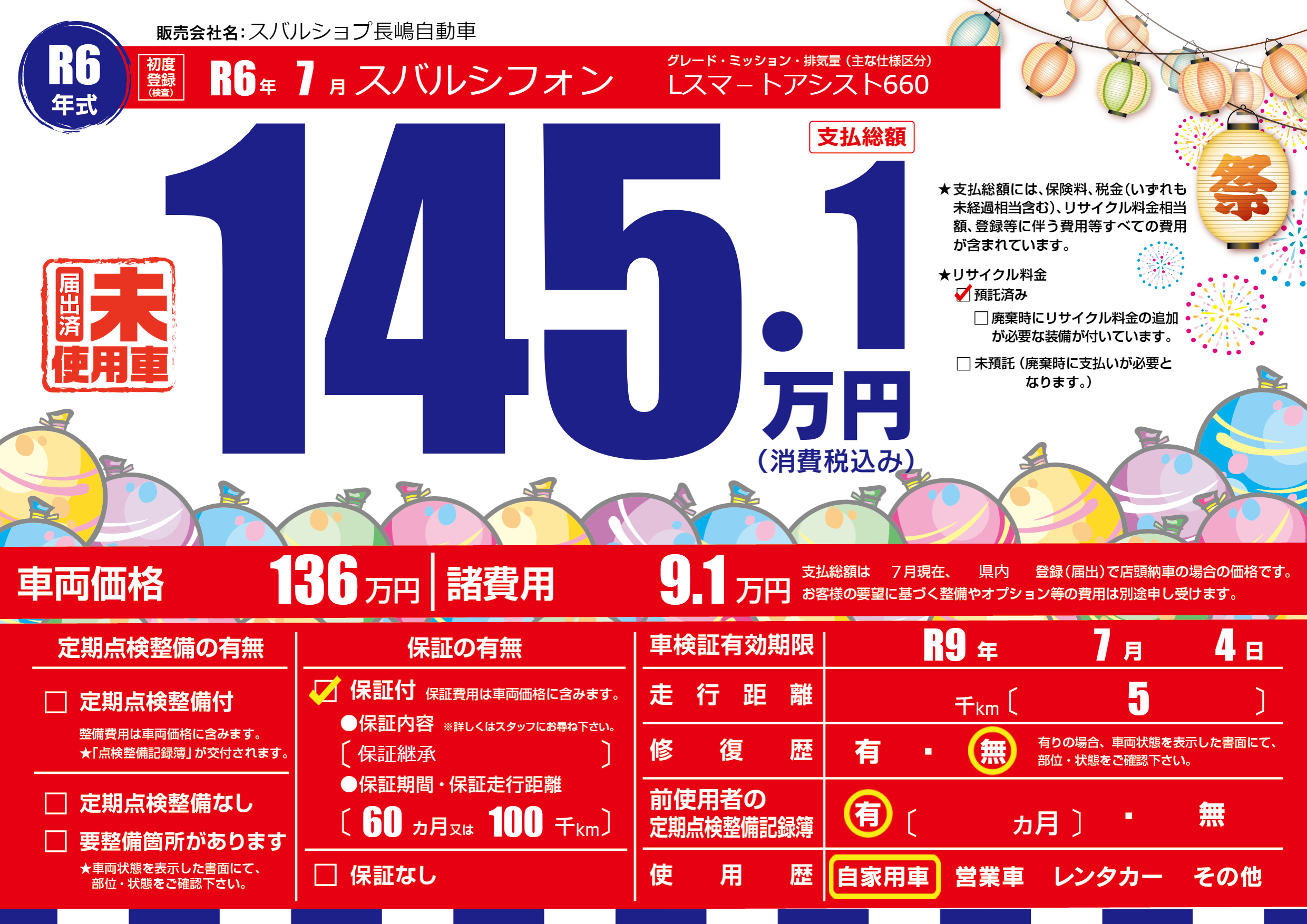 | 走行キロ | - | 初年度登録 | R6年7月 |