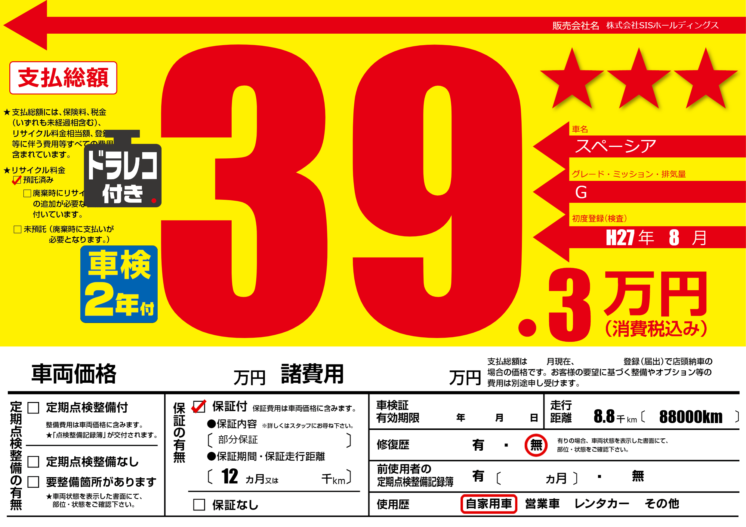| 走行キロ | 0.8万km | 初年度登録 | H27年8月 |