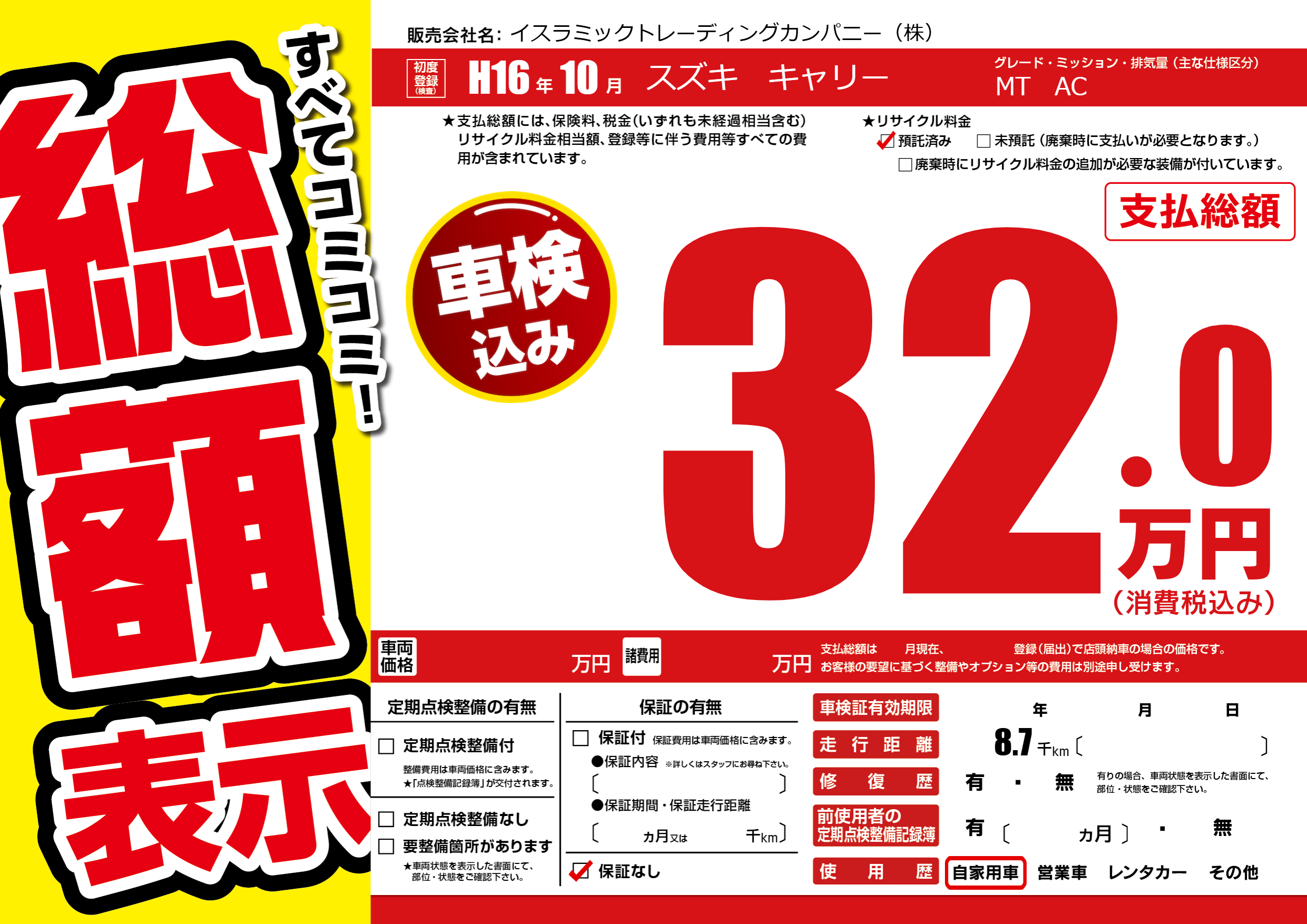 | 走行キロ | 0.8万km | 初年度登録 | H16年10月 |