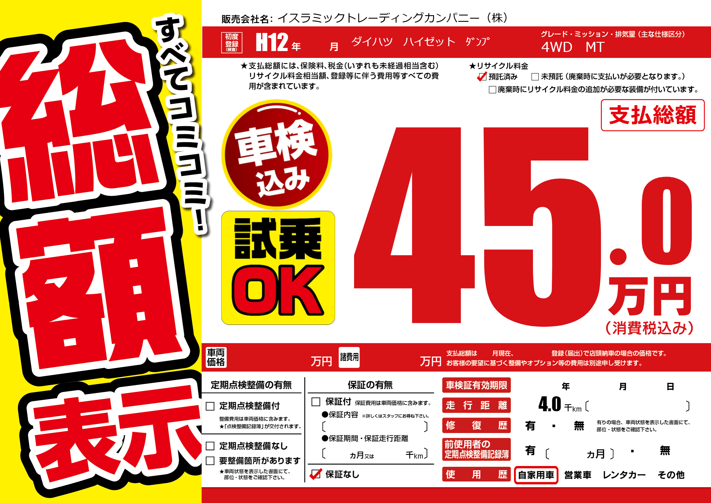 | 車名 | ダイハツ ハイゼット ダンプ | グレード ミッション 排気量 |