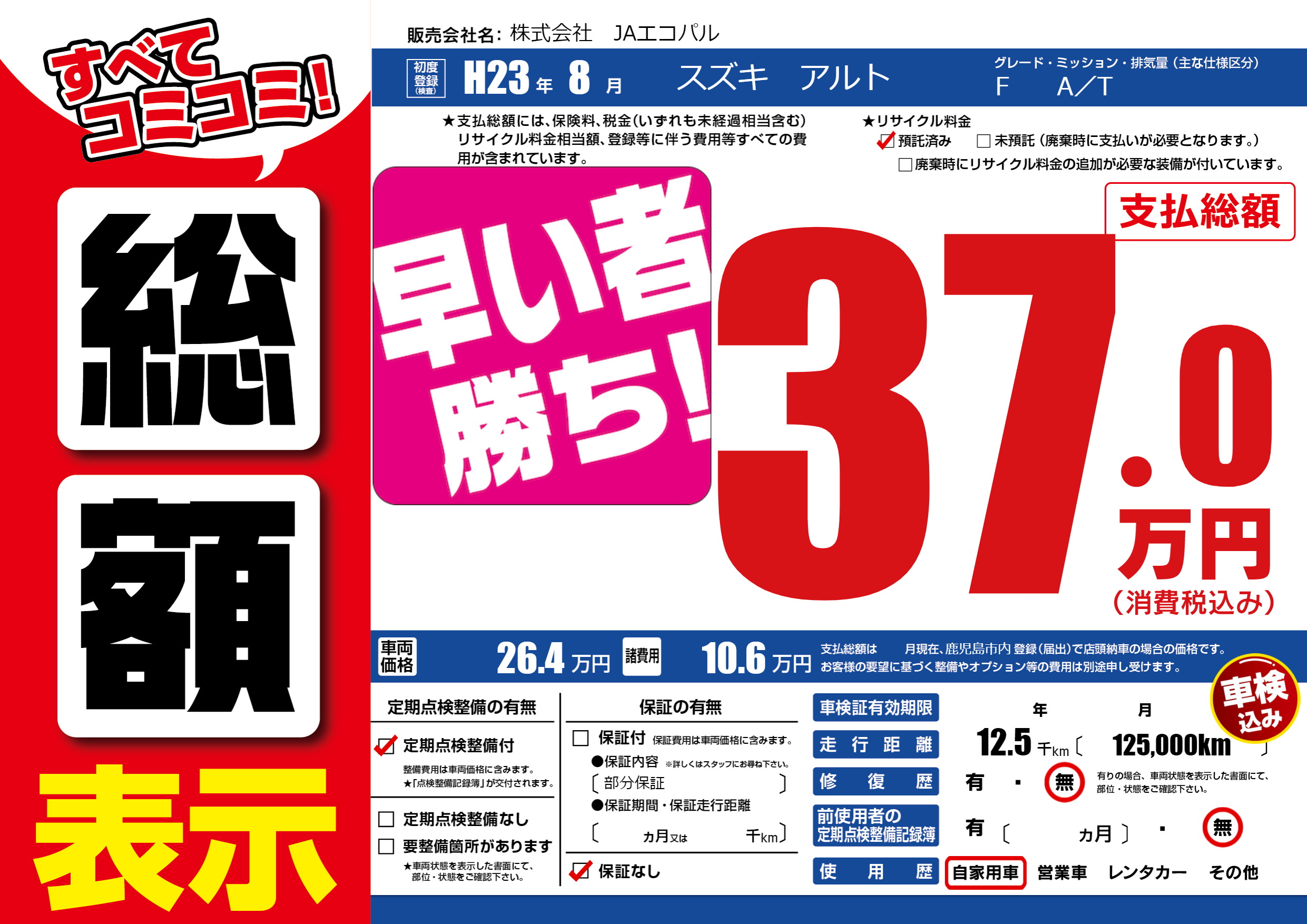 | 車名 | スズキ アルト | グレード ミッション 排気量 |