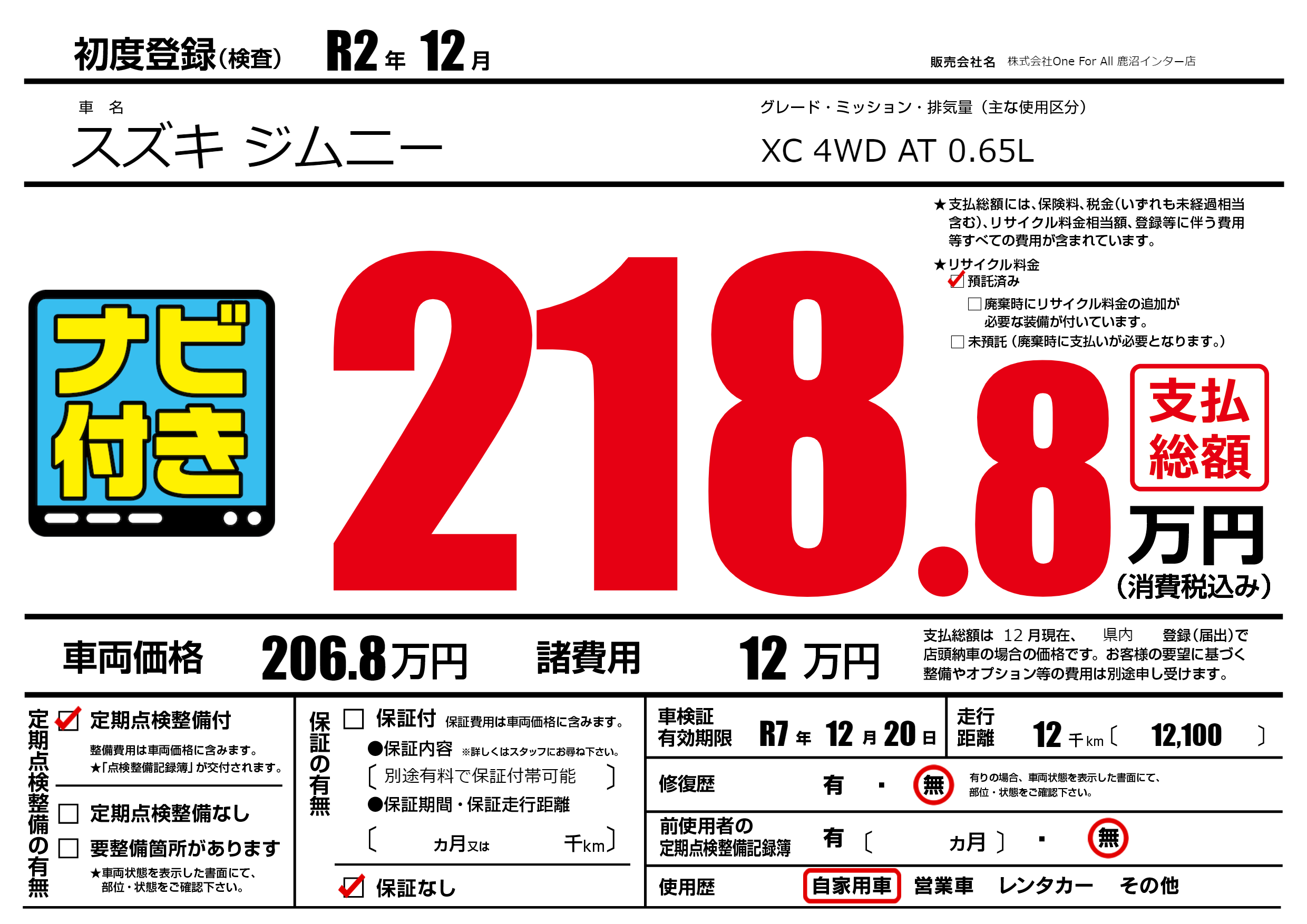 | 車検制限 | R7年 12月 20日 | ||