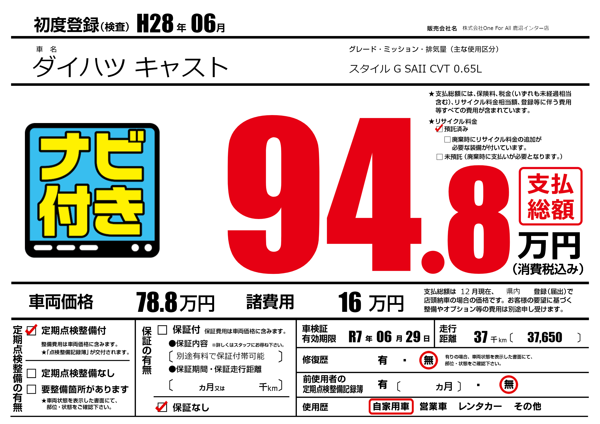 | 走行キロ | 3.7万km | 初年度登録 | H28年06月 |