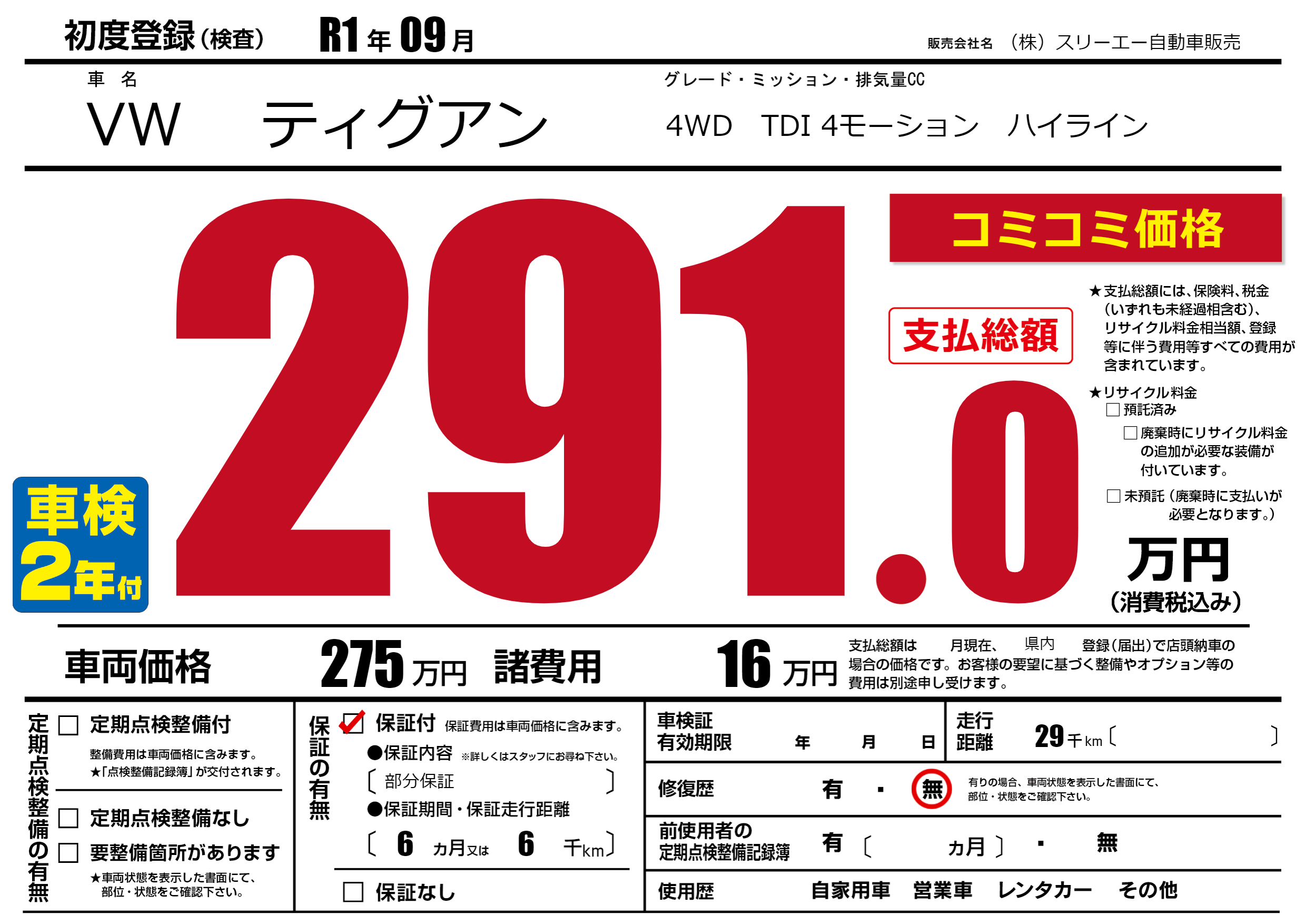 | 車名 | VW ティグアン | グレード ミッション 排気量 |