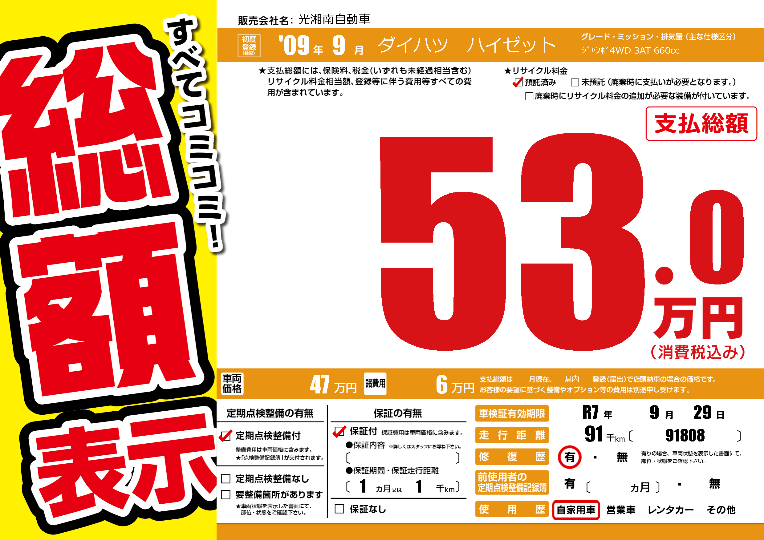 | 走行キロ | 9.1万km | 初年度登録 | '09年9月 |