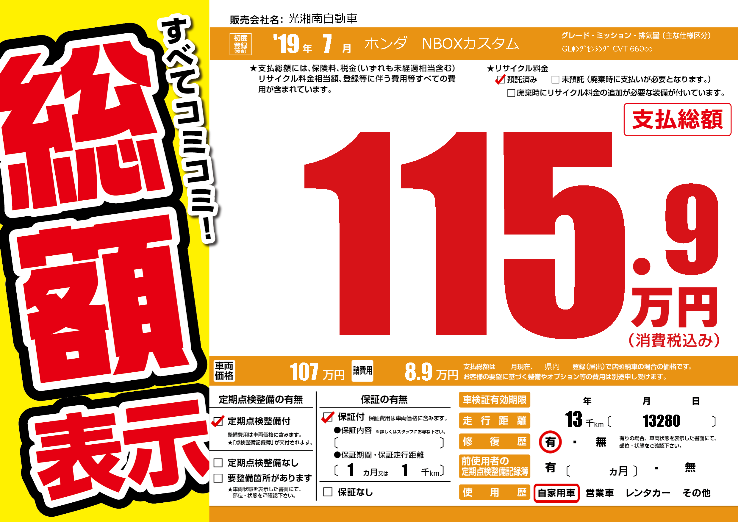| 走行キロ | 1.3万km | 初年度登録 | '19年7月 |
