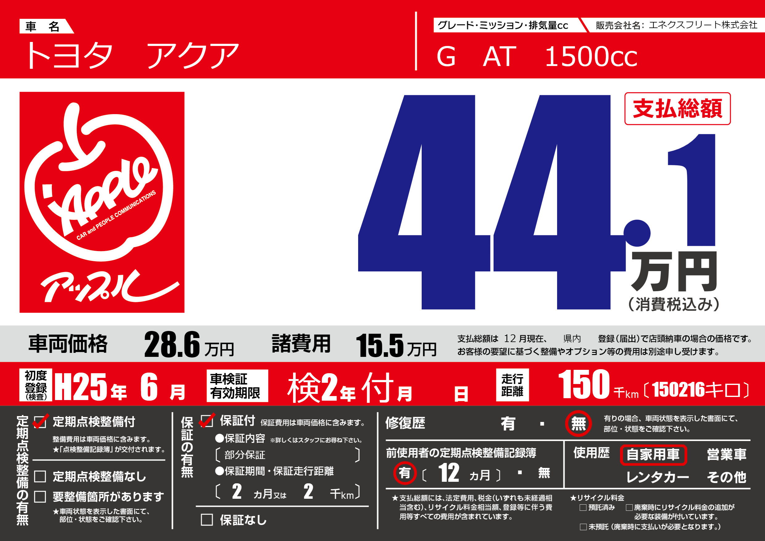 | 走行キロ | 15万km | 初年度登録 | H25年6月 |