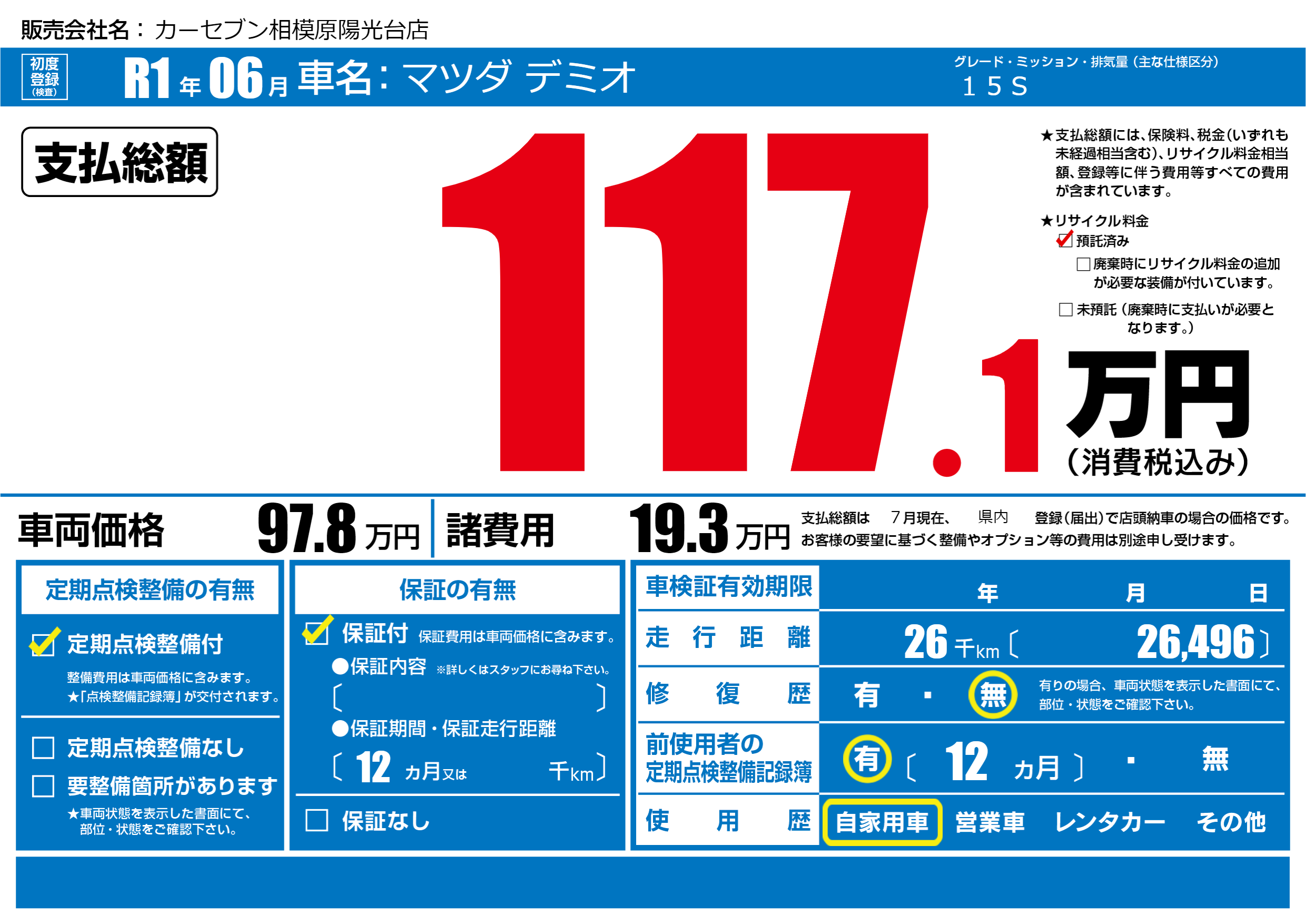 | 車名 | マツダ デミオ | グレード ミッション 排気量 |