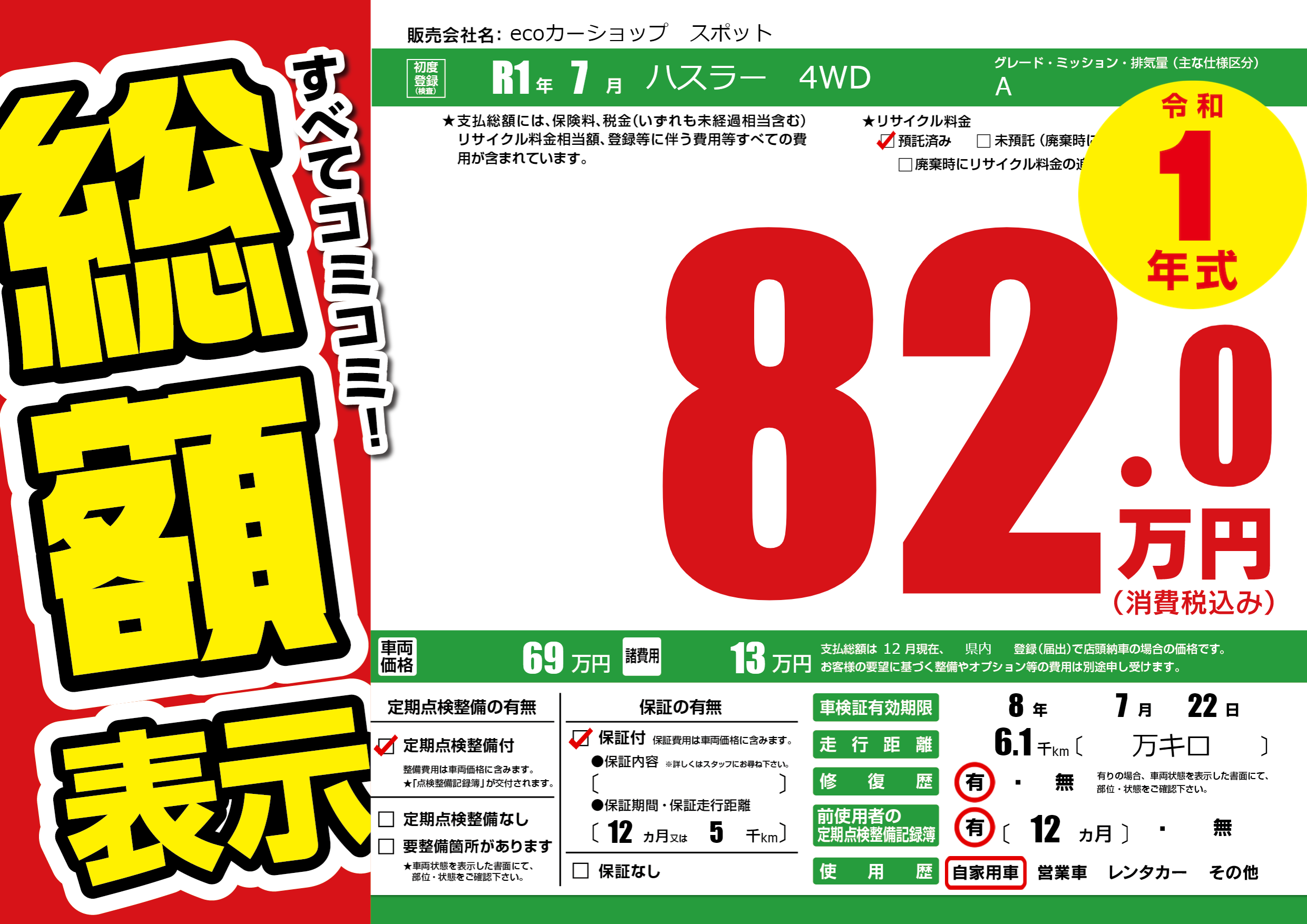 | 車名 | ハスラー 4WD | グレード ミッション 排気量 |