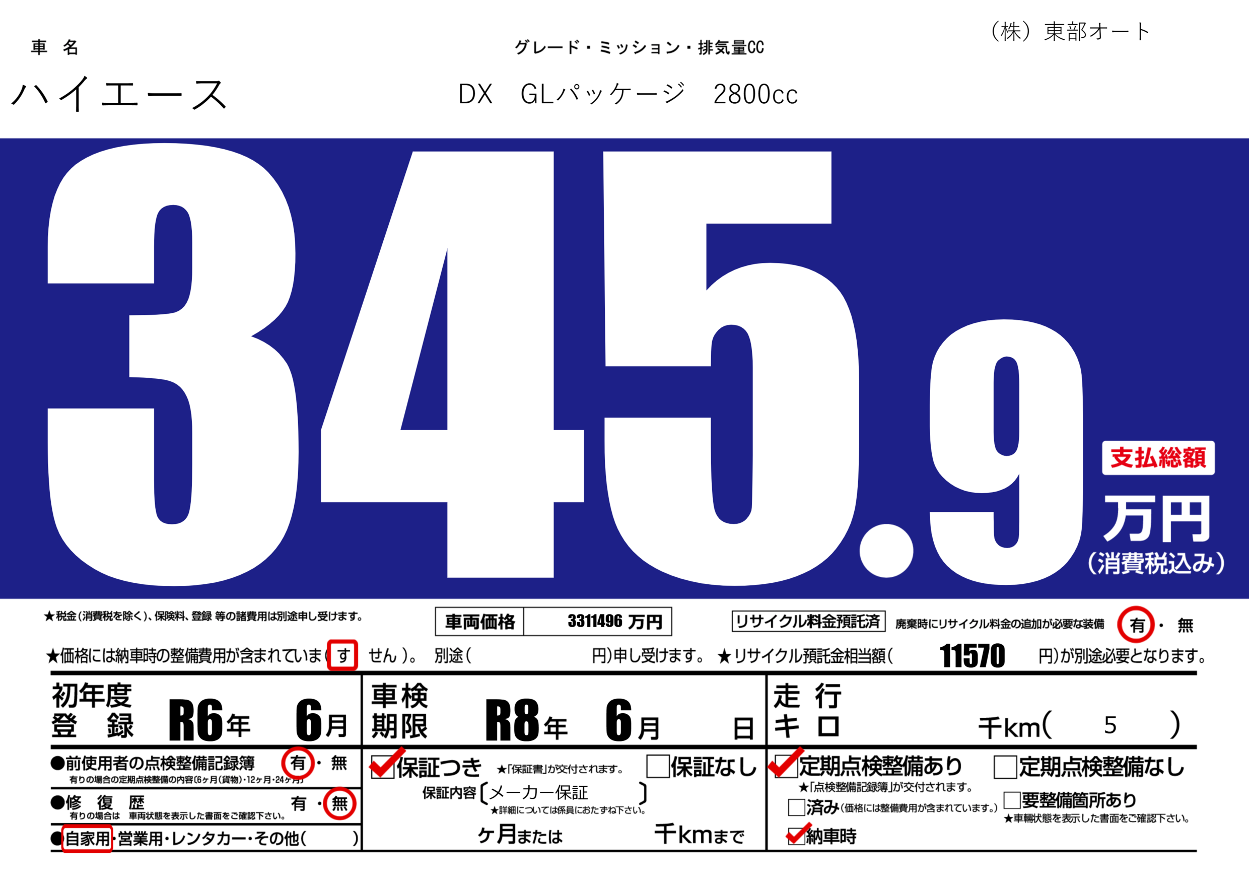 | 車名 | ハイエース | グレード ミッション 排気量 |