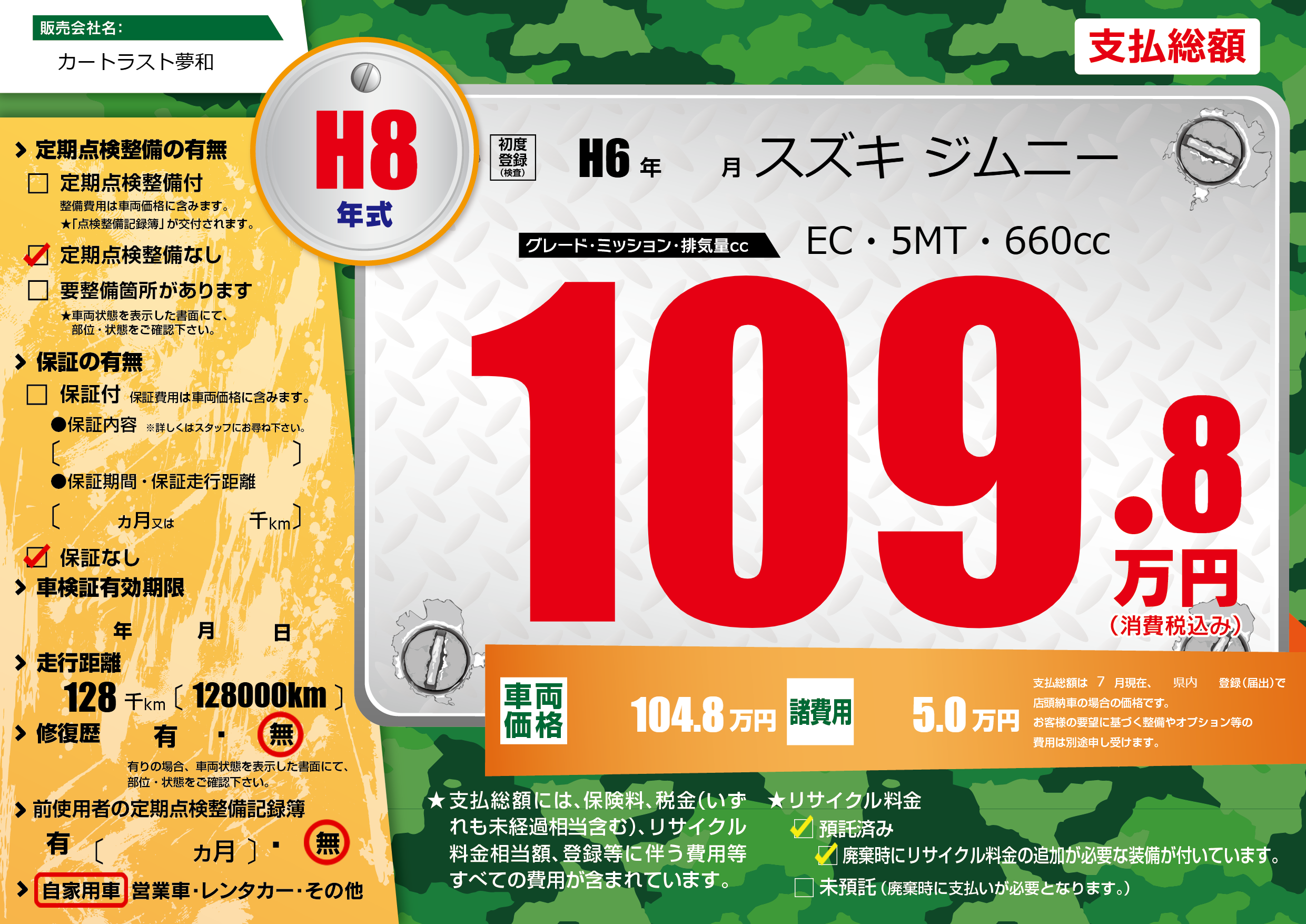 | 走行キロ | 12.8万km | 初年度登録 | H6年---月 |