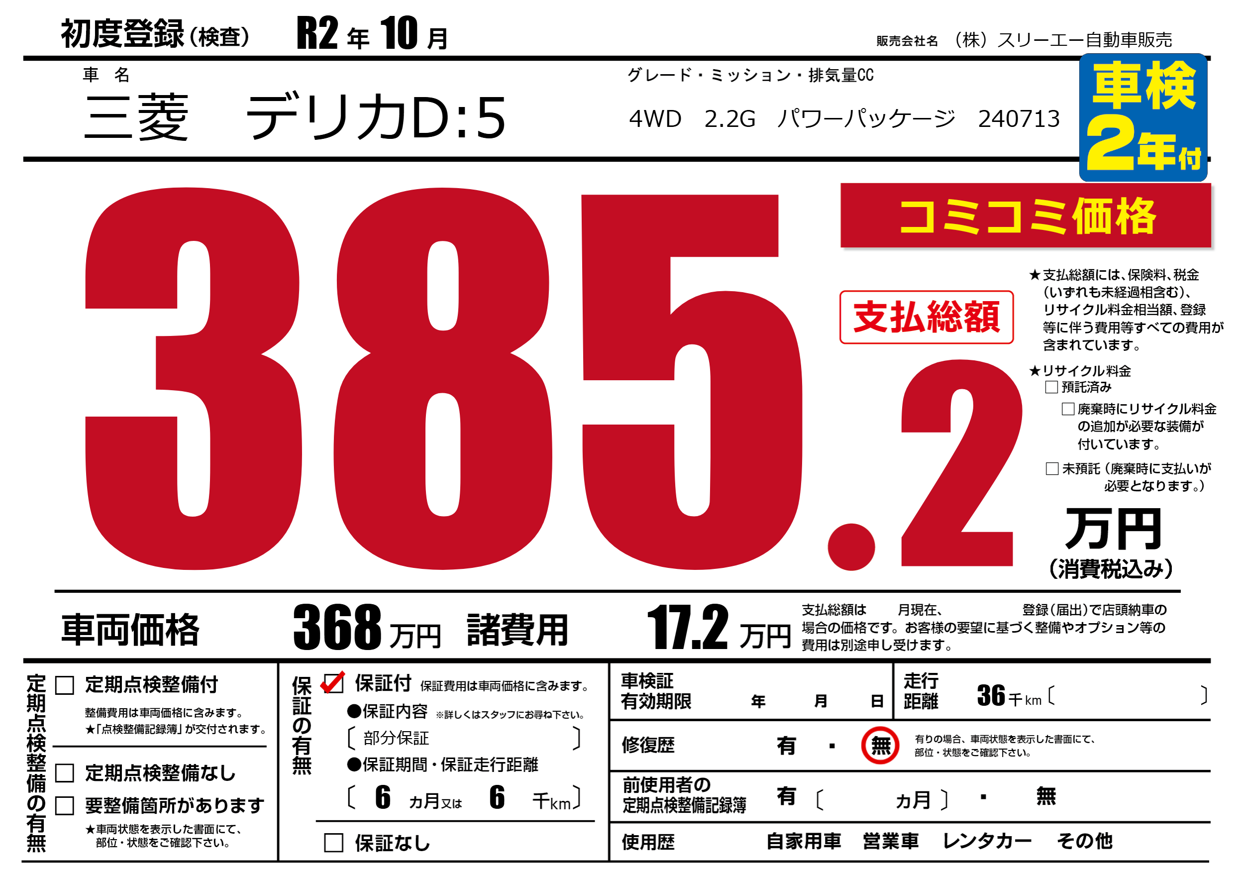 | 車名 | 三菱 デリカD:5 | グレード ミッション 排気量 |