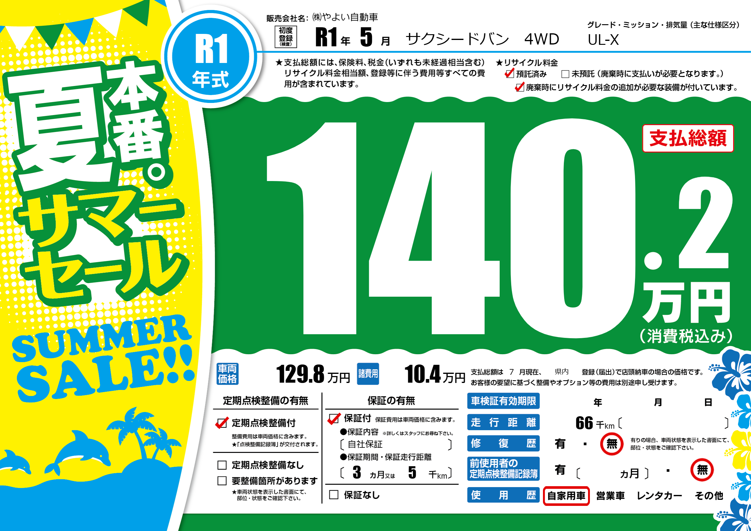 | 車名 | サクシードバン 4WD | グレード ミッション 排気量 |