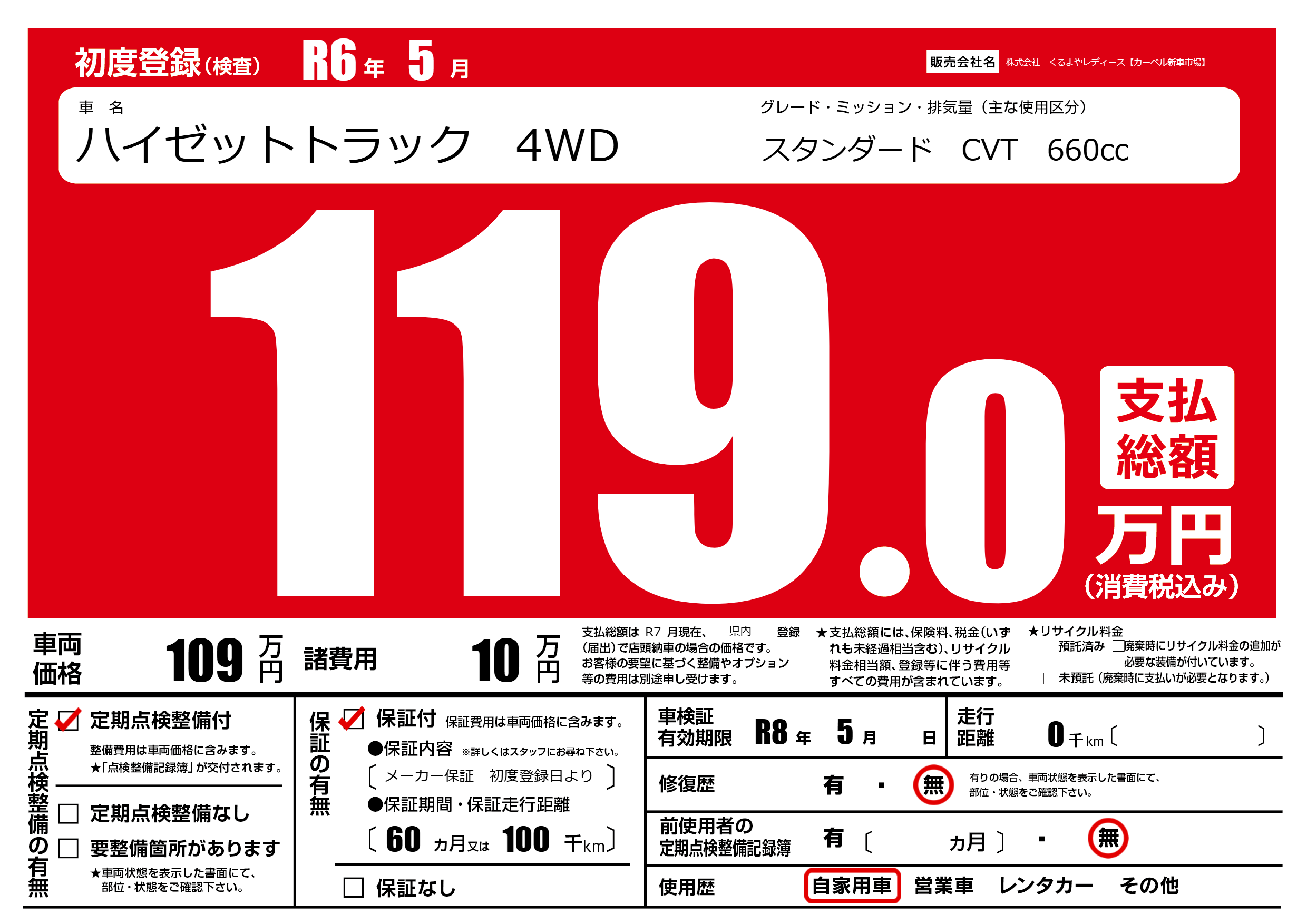 | 車名 | ハイゼットトラック 4WD | グレード ミッション 排気量 |