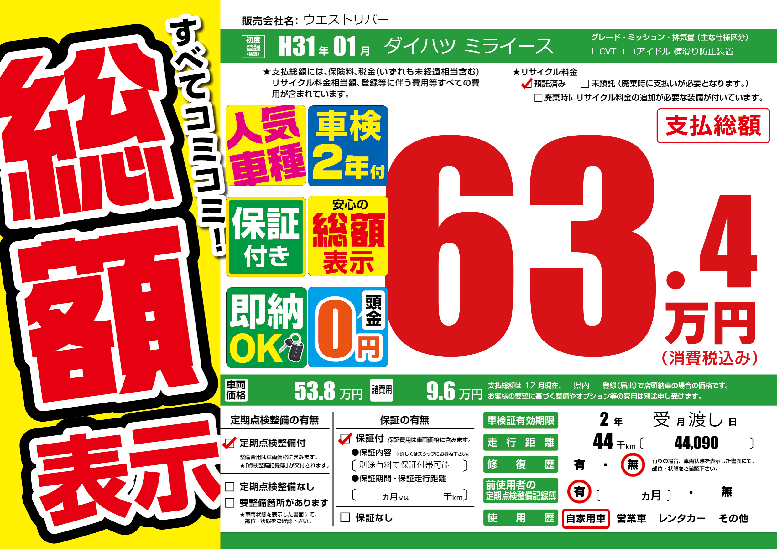 | 走行キロ | 4.4万km | 初年度登録 | H31年01月 |
