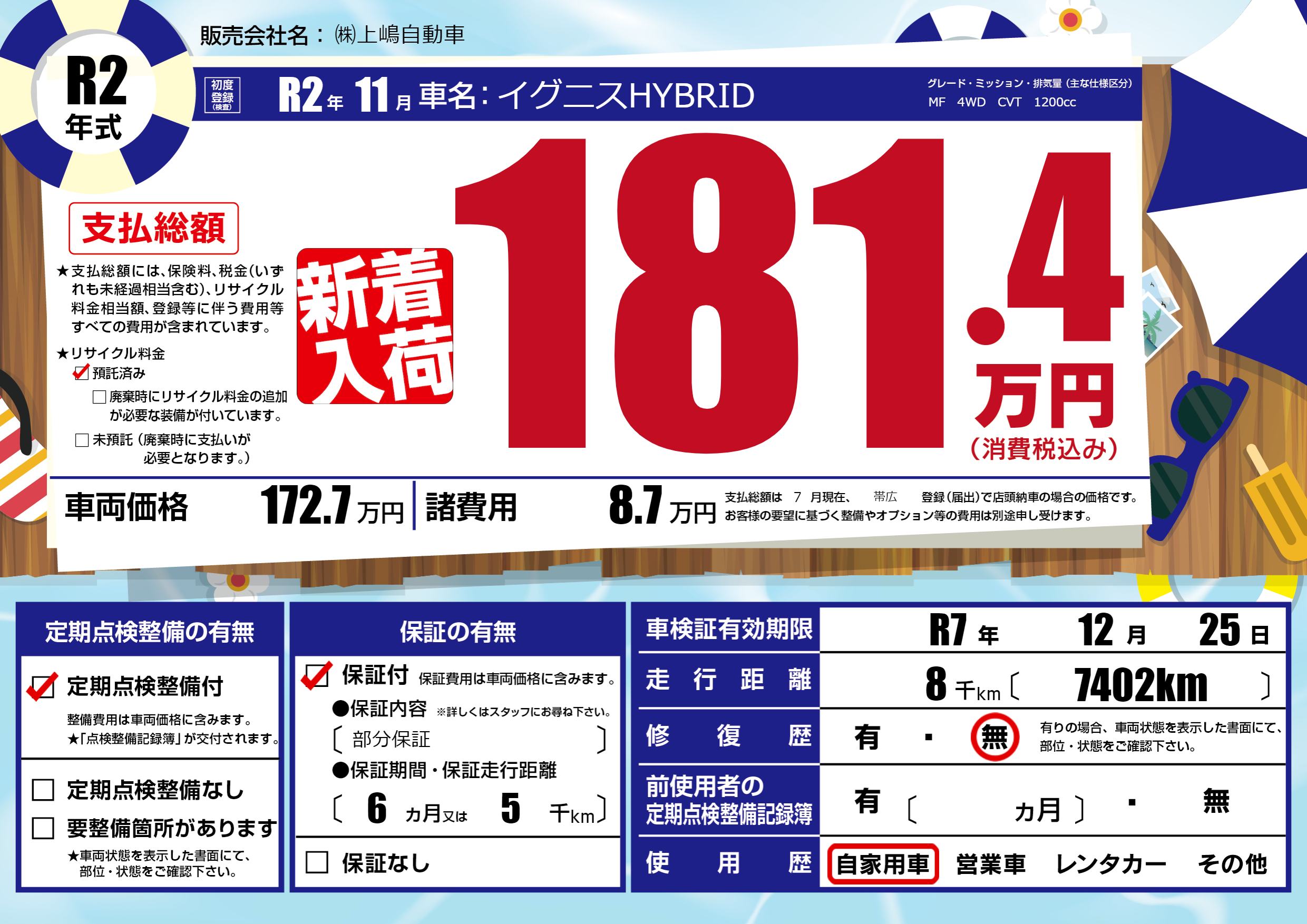 | 走行キロ | 0.8万km | 初年度登録 | R2年11月 |