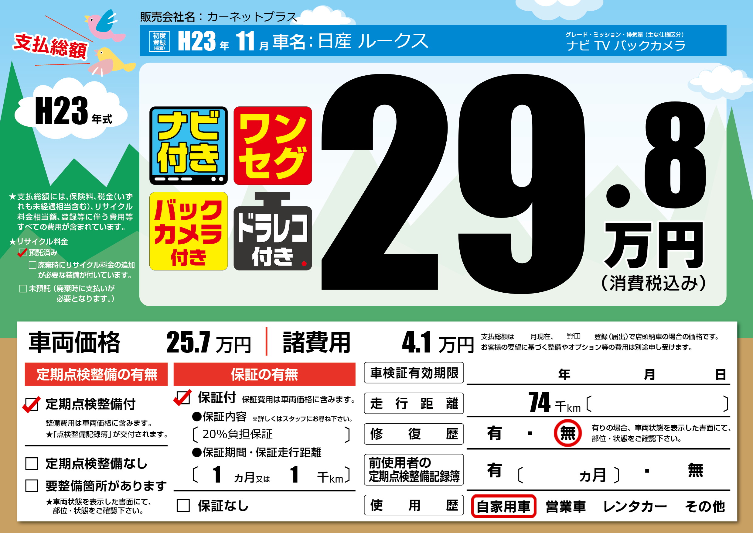 | 走行キロ | 7.4万km | 初年度登録 | H23年11月 |