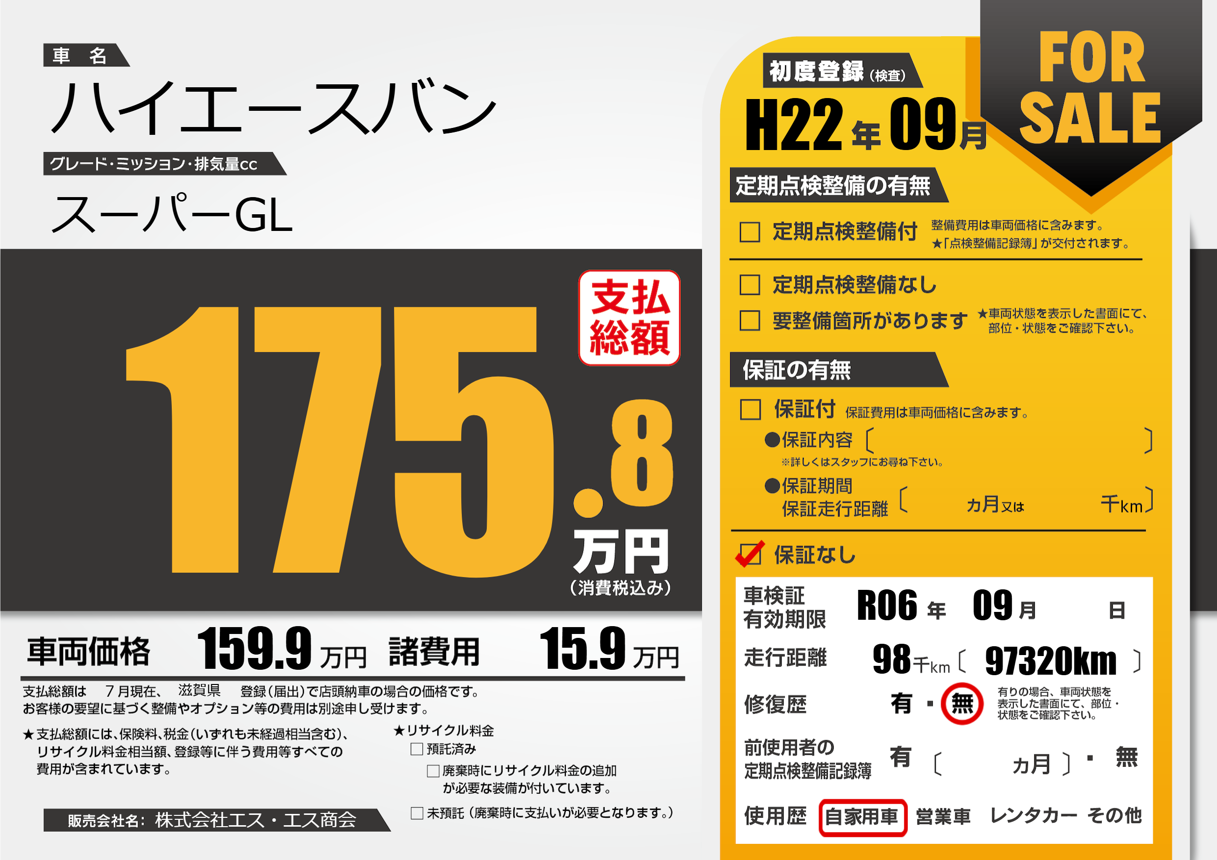 | 走行キロ | 9.8万km | 初年度登録 | H22年09月 |