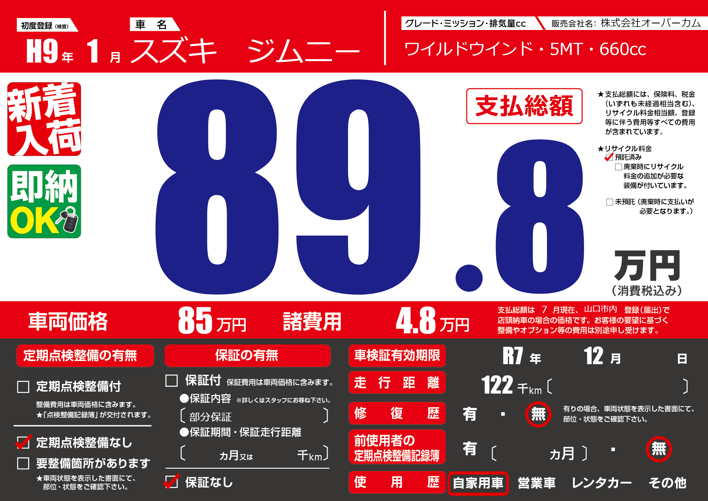 | 走行キロ | 12.2万km | 初年度登録 | H9年1月 |