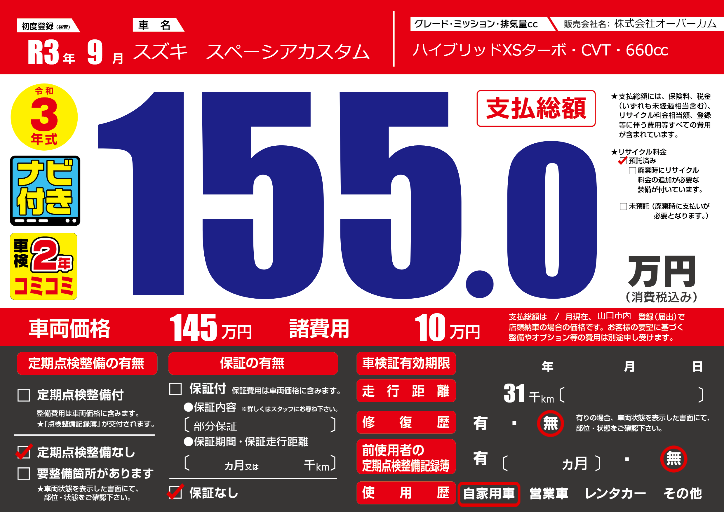 保証なし 保証内容(部分保証) ---ヶ月または()千kmまで |