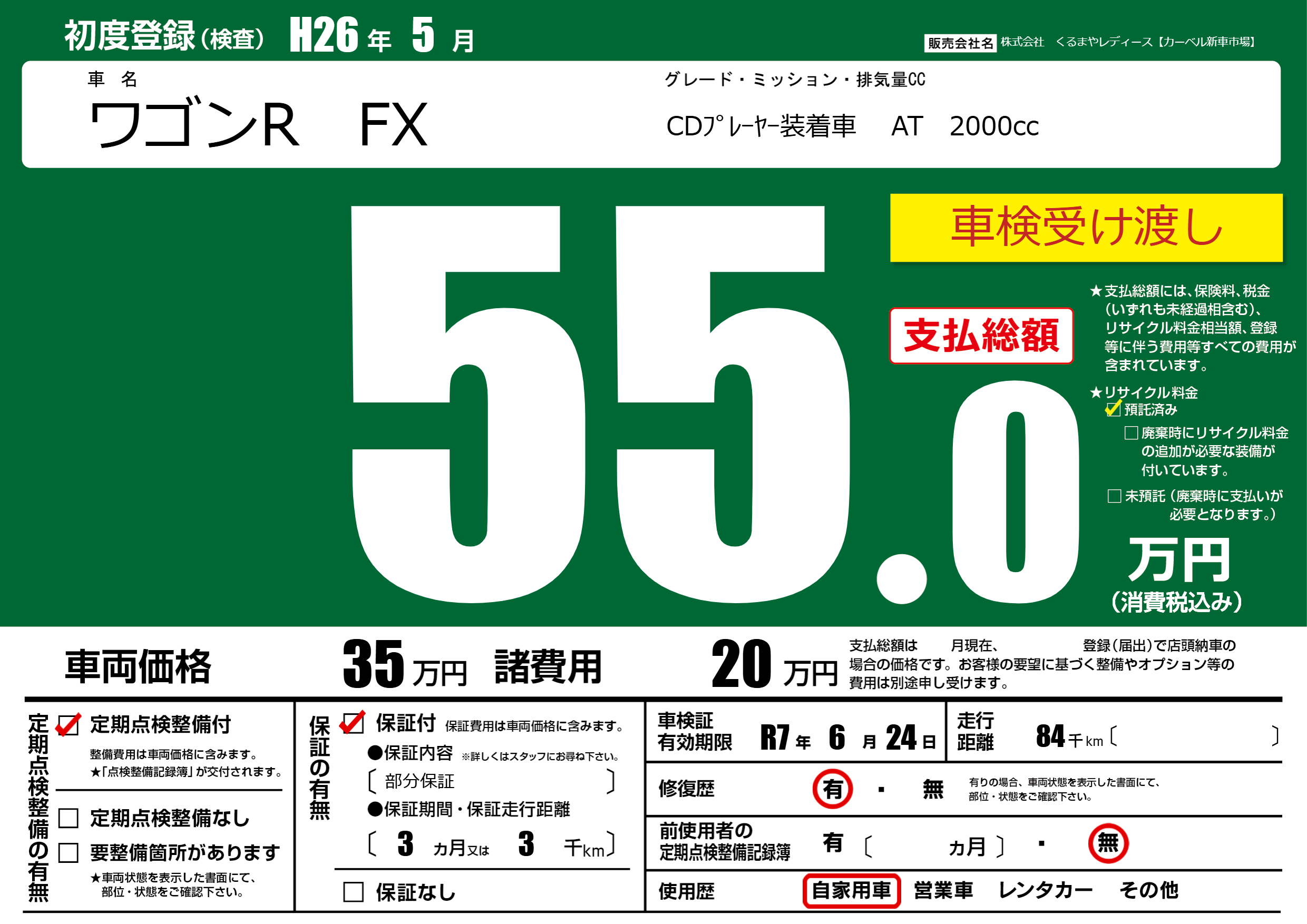 | 車名 | ワゴンR FX | グレード ミッション 排気量 |