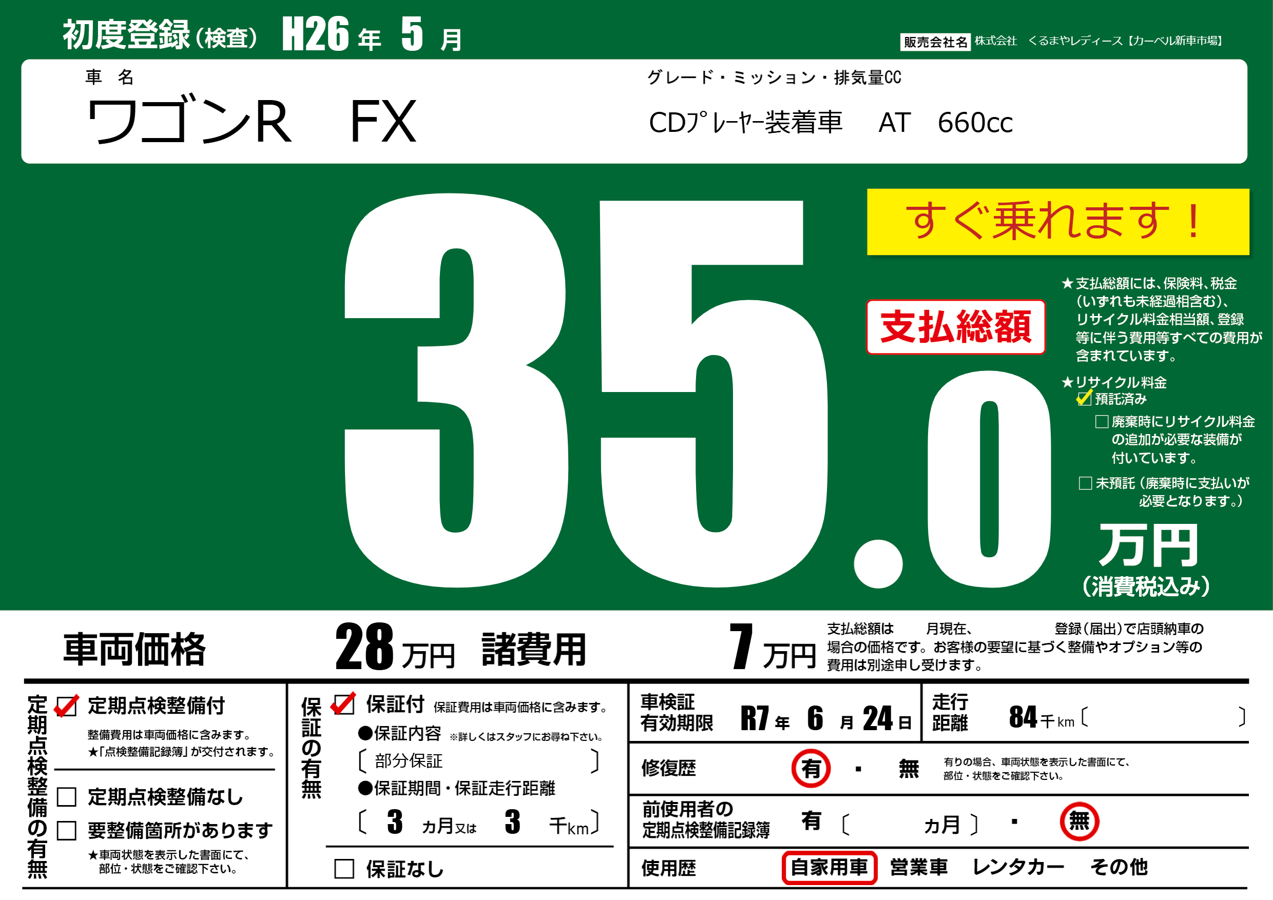 | 車名 | ワゴンR FX | グレード ミッション 排気量 |