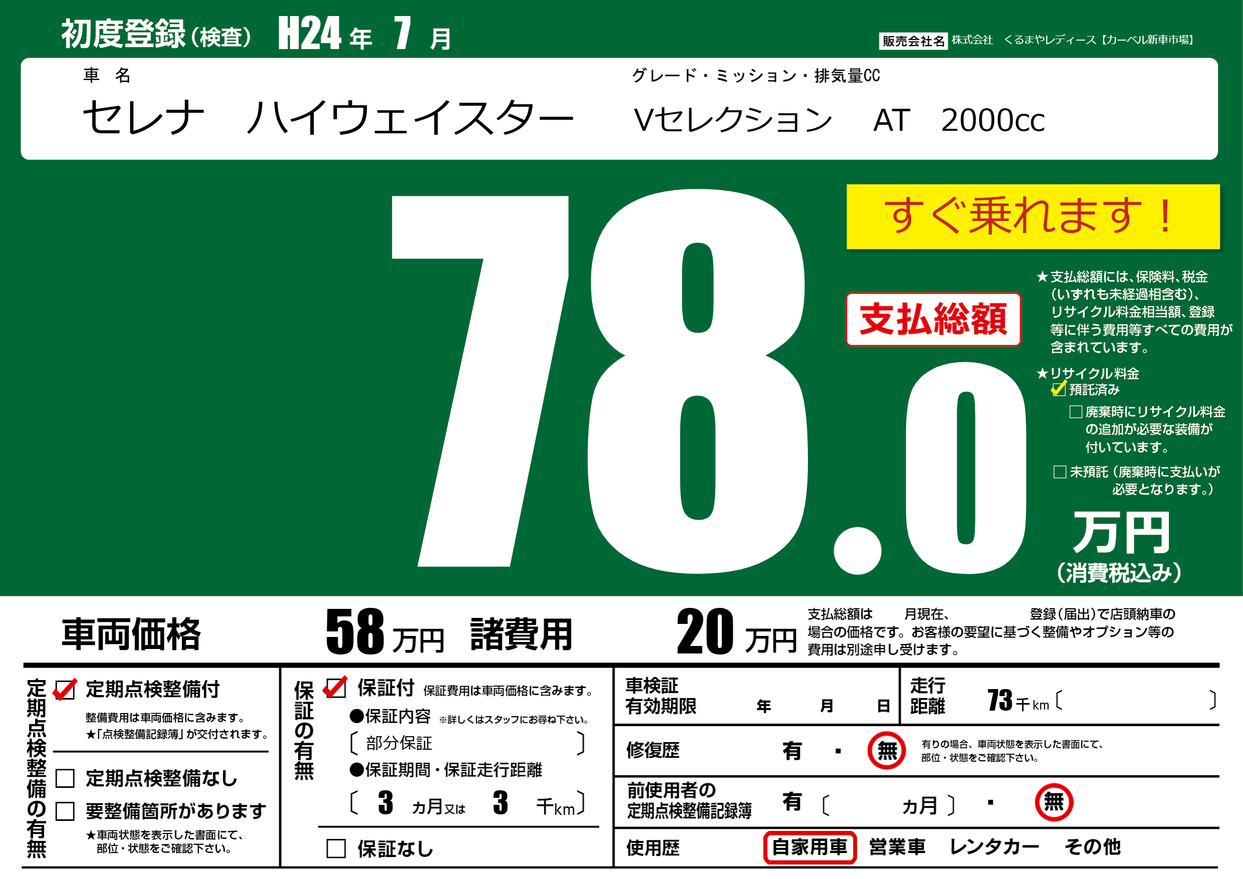 | 走行キロ | 7.3万km | 初年度登録 | H24年7月 |