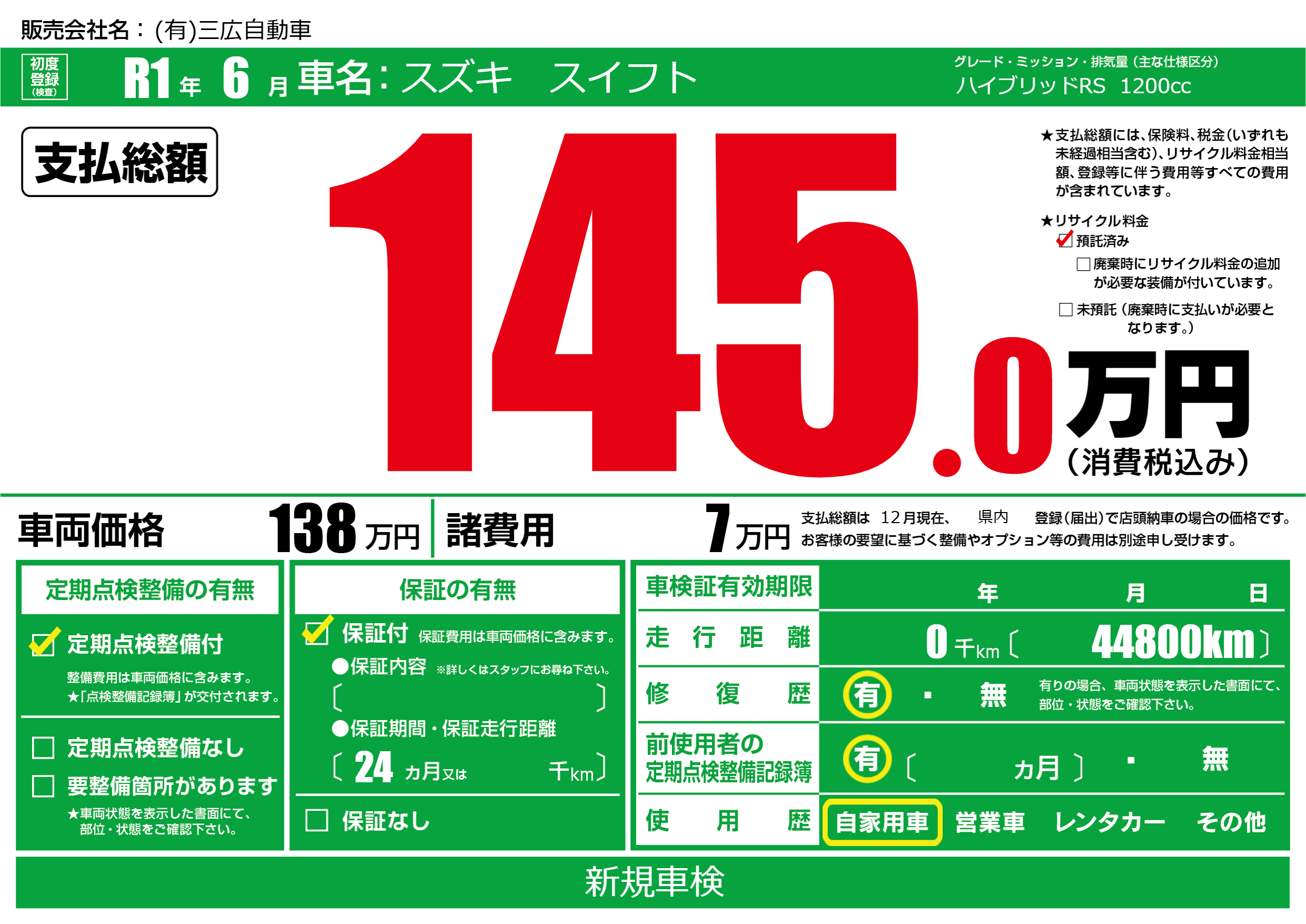 保証付き 保証内容(---) 24ヶ月または()千kmまで |