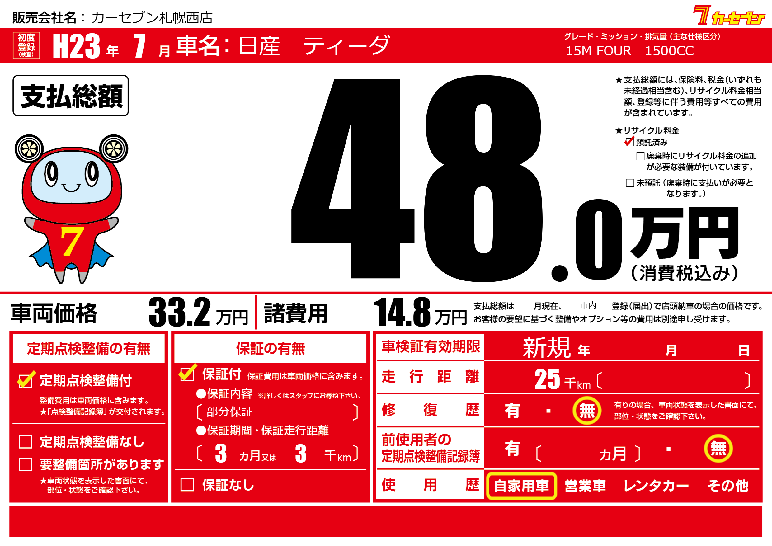 | 車名 | 日産 ティーダ | グレード ミッション 排気量 |