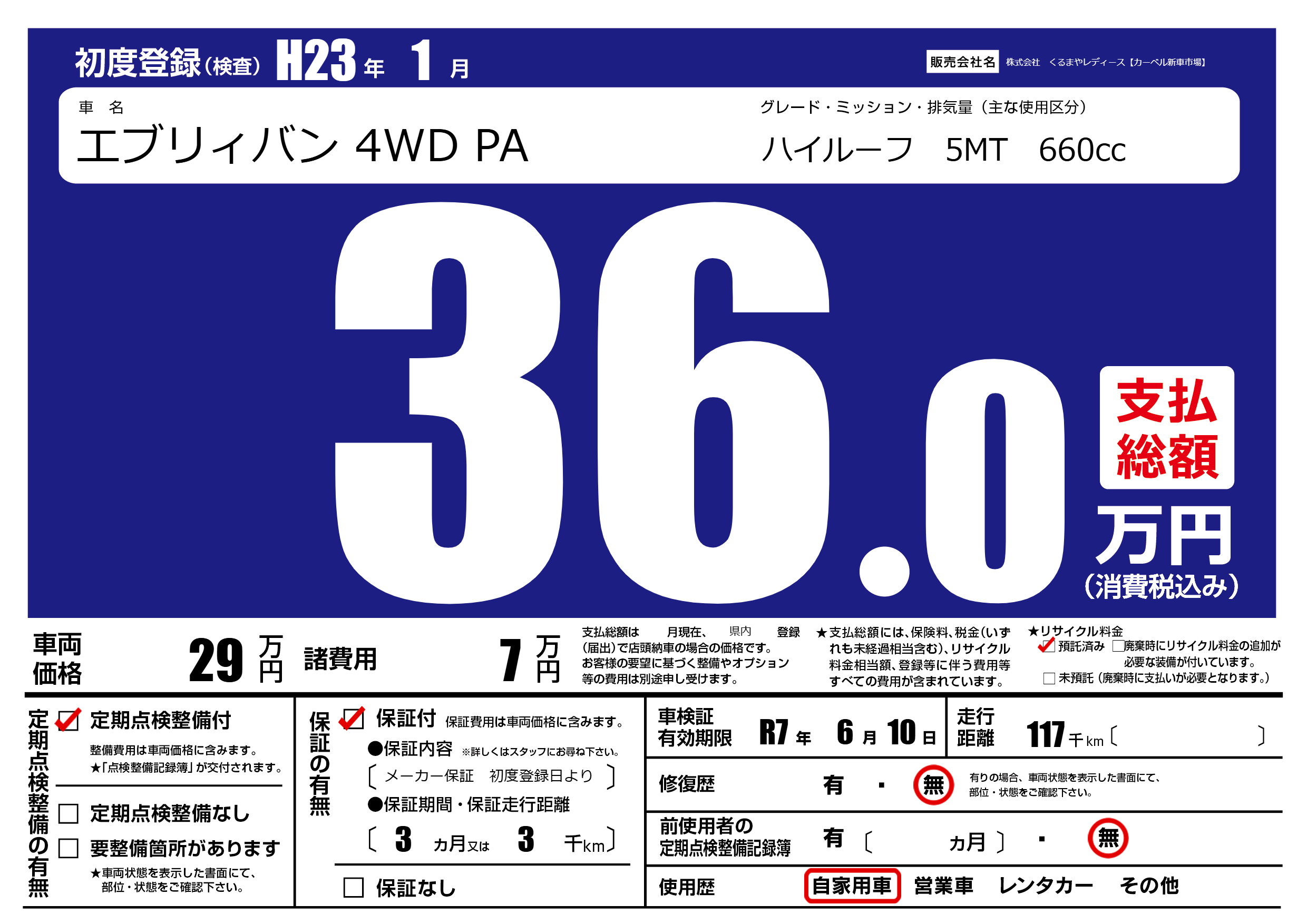 | 走行キロ | 11.7万km | 初年度登録 | H23年1月 |