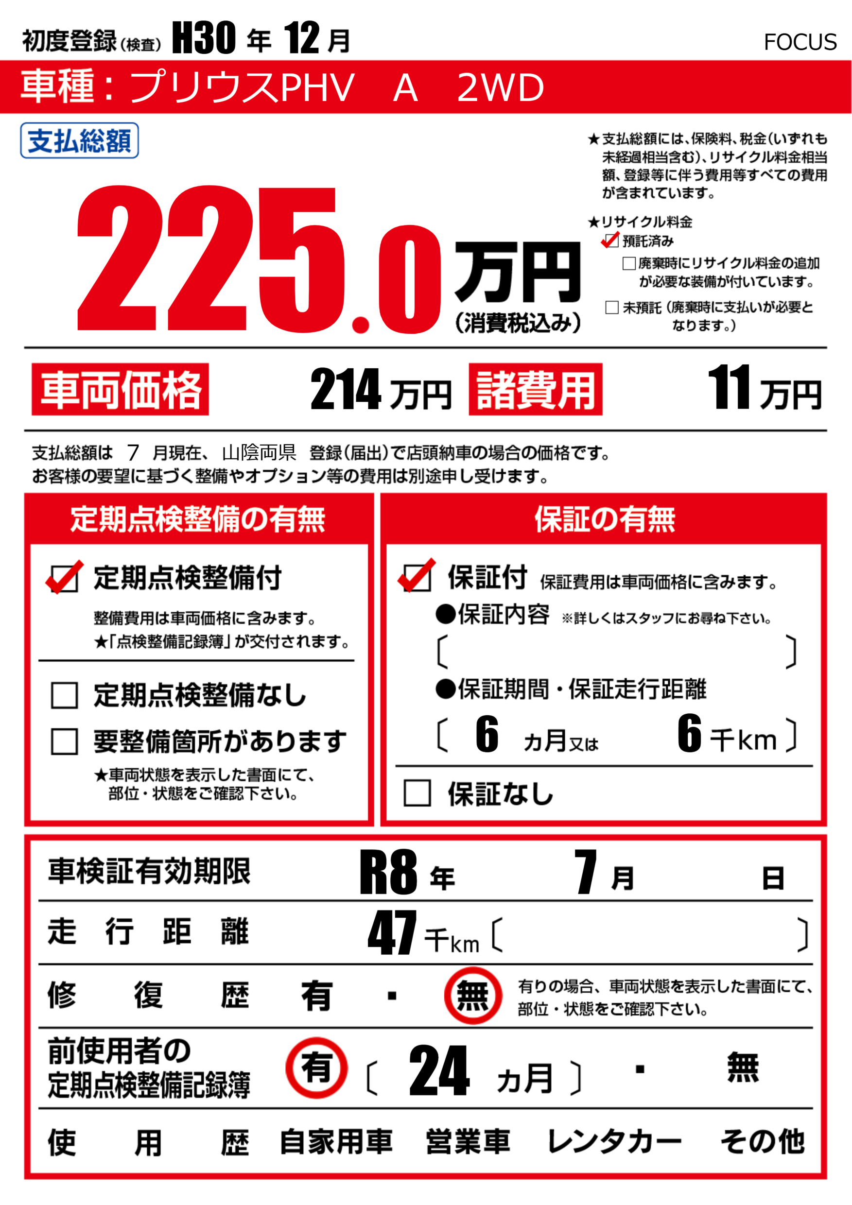 | 車名 | プリウスPHV A 2WD | グレード ミッション 排気量 |