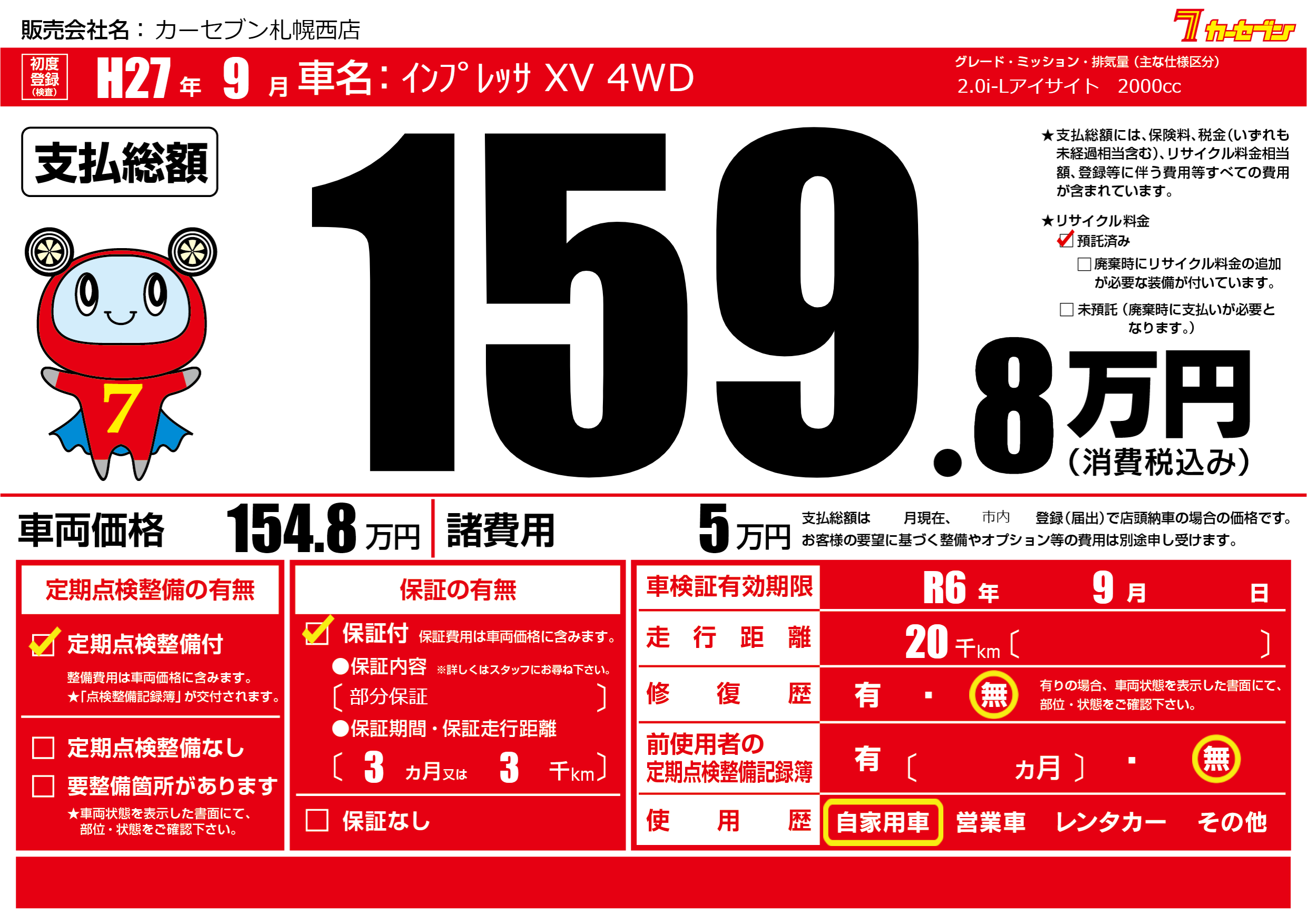 | 車名 | インプレッサ XV 4WD | グレード ミッション 排気量 |