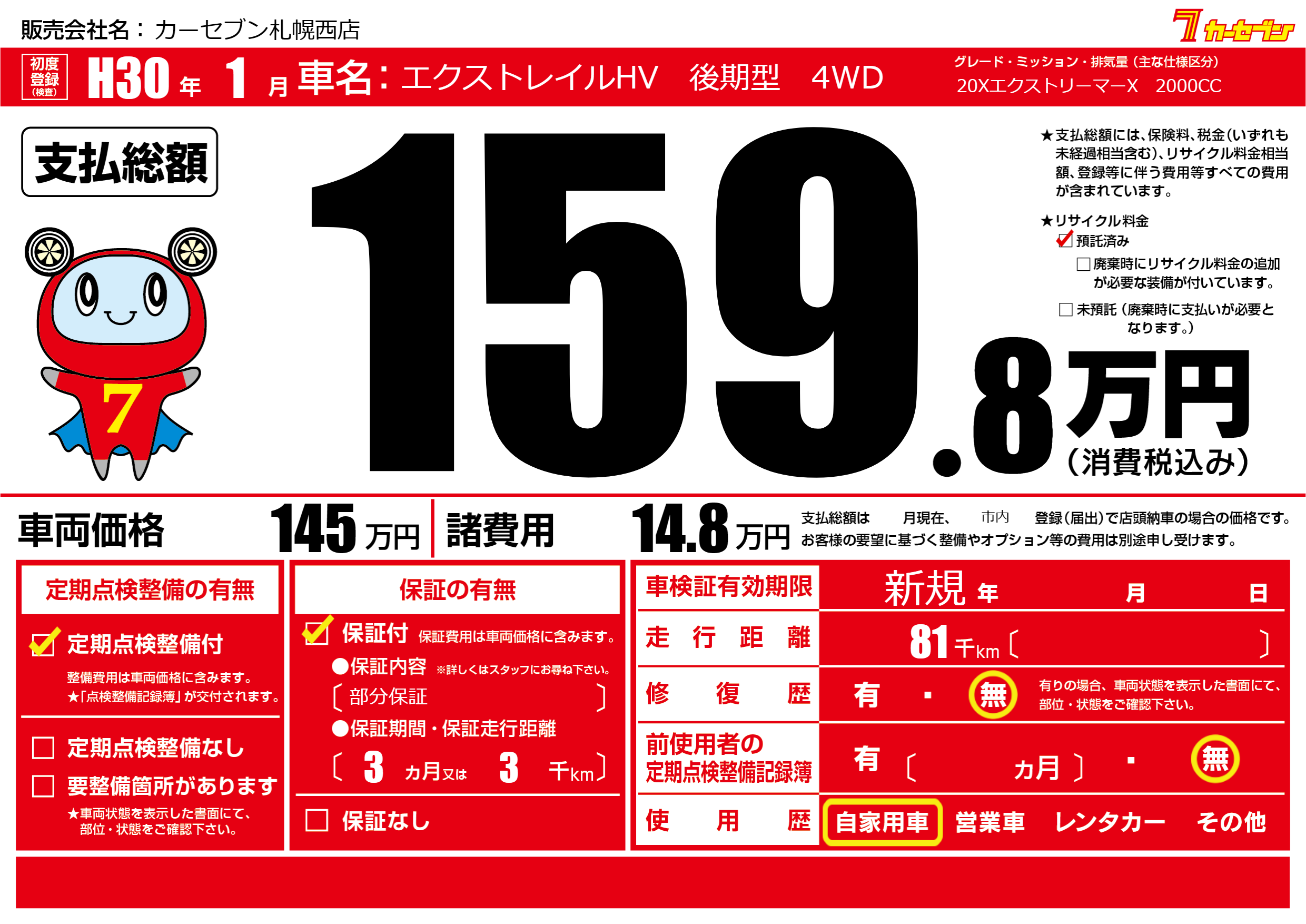 | 車名 | エクストレイルHV 後期型 4WD | グレード ミッション 排気量 |