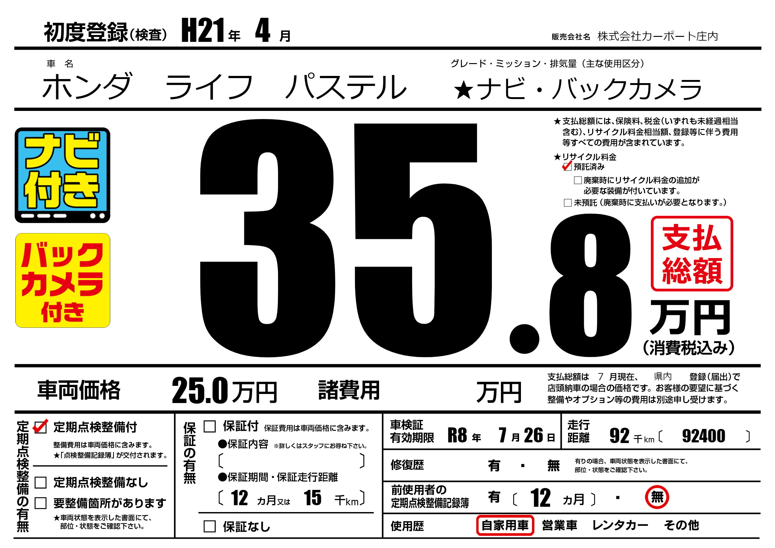 | 車検制限 | R8年 7月 26日 | ||