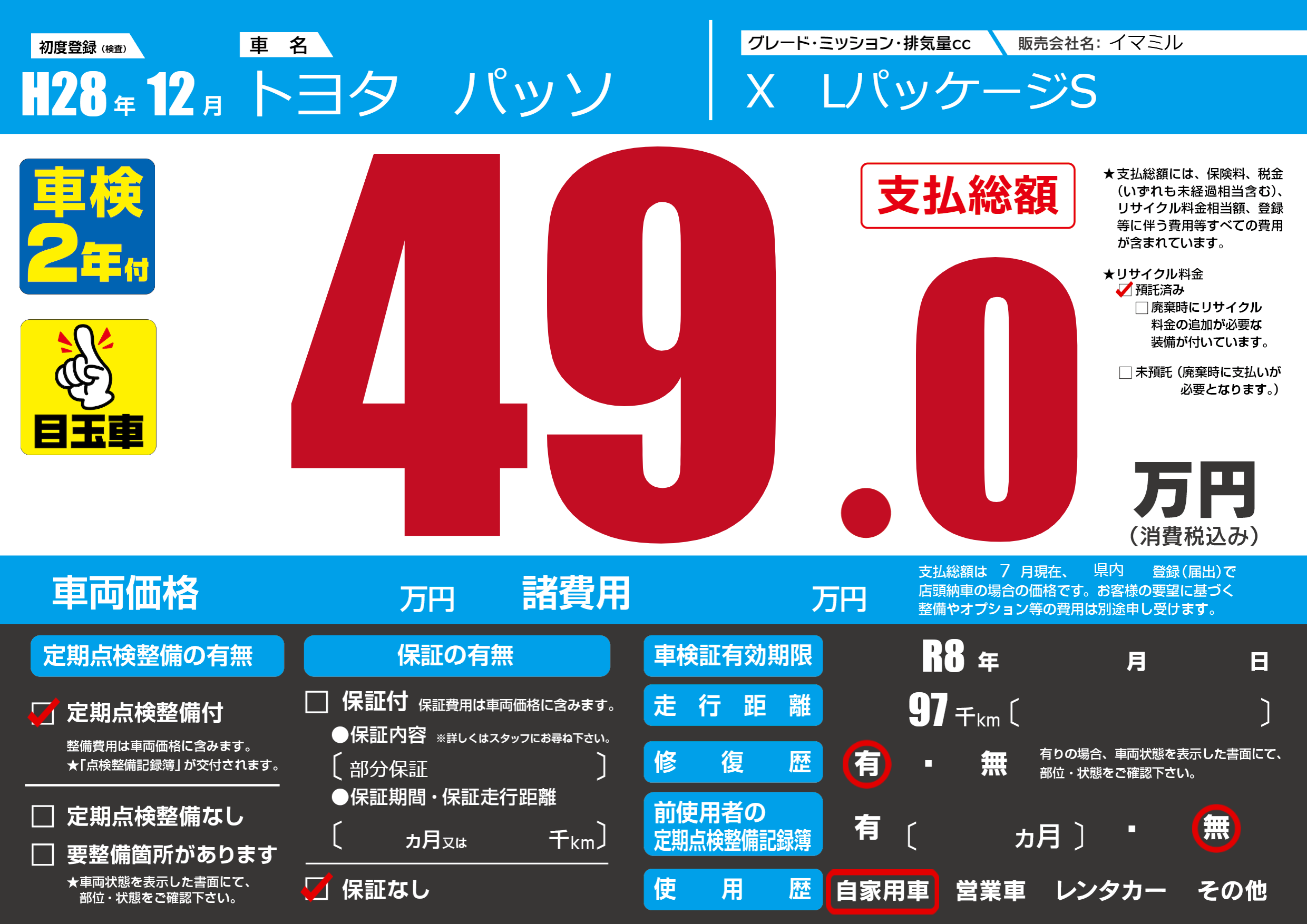 | 車名 | トヨタ パッソ | グレード ミッション 排気量 |