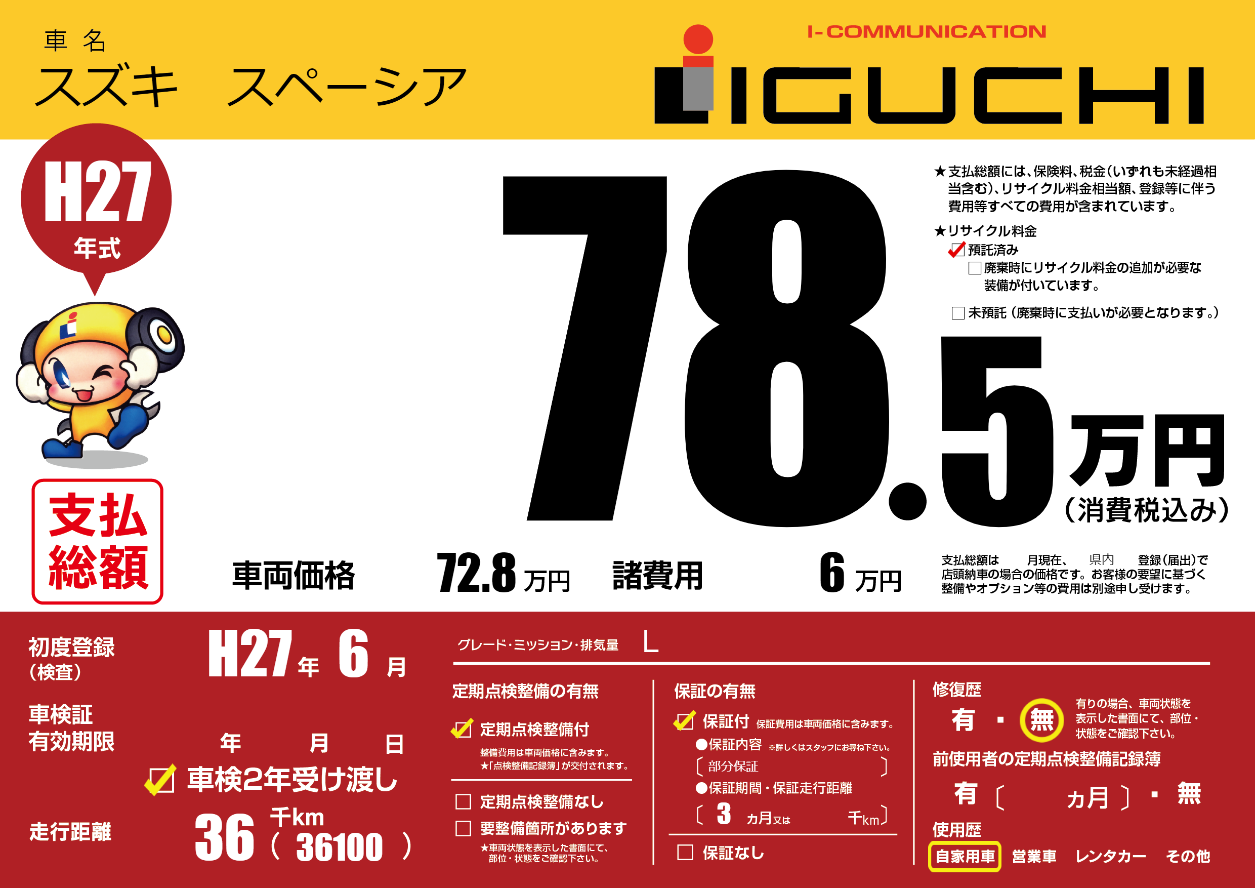 | 走行キロ | 3.6万km | 初年度登録 | H27年6月 |
