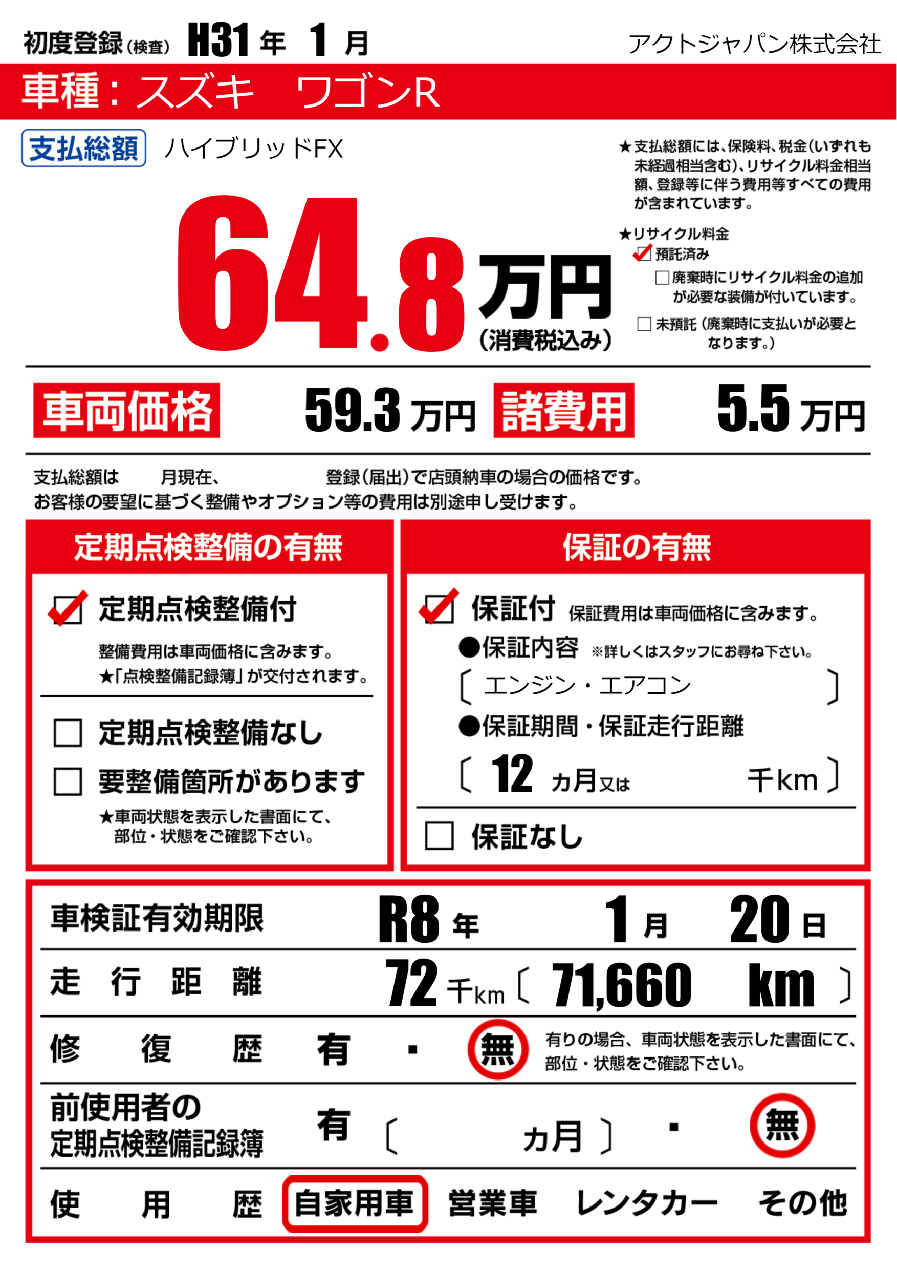 | 車名 | スズキ ワゴンR | グレード ミッション 排気量 |